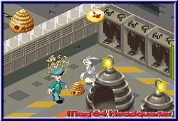 Während Duffy z.b. schwimmen kann, kann Bugs kleine Löcher im Boden als Art Teleporter zu entlegenen Orten nutzen um so alle Inhalte zu erspielen. Das Gameplay ist dabei so gestaltet das Ihr von verschiedenen anderen Charakteren im Spiel kleinere Aufträge bekommt. Sammelt dies, aktiviert das oder erledigt den..., könnte man dies auf einen Nenner bringen. Also auch hier das typische Banjo Gameplay. So lauft Ihr also durch die Areale, die angenehm groß sind und macht euch auf die Suche nach den Affen. Ein kleiner Pfeil weißt euch grob die Richtung zu wenn Ihr eine Aufgabe angenommen habt. Neben dem Sprungfeature mit der A-Taste können beide auch austeilen. Allerdings nichts von Hause aus, sondern durch die Benutzung kleiner Kästen. Ähnlich der Briefkästen auf dem GCN enthalten diese verschiedene Items wie Eier zum Werfen, ein Roadrunner Symbol zum Beschleunigen oder ein Unverwundbar Item. Positiv das der Spieler genau planen kann welches davon er möchte und nicht per Zufall eines bekommt. Gerade bei heiklen Situationen in denen die Lebensleiste gen Null tendiert ist das Unverwundbarkeitsitem nicht das schlechteste. Denn Gegner findet man auch hier zuhauf, die dazu auch noch immer wieder neu generiert werden. Rücksetzpunkte stellen die Auftraggeber einer Aufgabe dar, wobei positiv ist das Ihr zwar bei einem Ableben dort landet, gefundene Affen aber trotzdem in eurem Besitz bleiben. 12 Affen kann man pro Welt finden um die jeweils nächste freizuschalten. Hier gibt es auch die größte Kritik im Spiel. Man muß wirklich alle komplett gefangen haben und damit die Welt komplett lösen ehe man ein Spiel speichern kann. Mit 3 Leben und 9 Continues ist man zunächst zwar gut ausgestattet. Allerdings gibt es genug Möglichkeiten nicht nur durch Gegner Leben zu verlieren. Mal falsch gesprungen oder in den zahlreichen Geschicklichkeitspassagen Fehler gemacht und es wird immer weniger. Auch bei mir der Fall das kurz vor dem 12. und finalen Affen in der ersten Welt all dies aufgebraucht war. Danach startet das Spiel neu, ohne das man irgendwie sichern konnte. Bei knapp 2 Stunden Spielzeit pro Welt ist dieses Risiko nicht zu unterschätzen und man legt den GBA erstmal in die Ecke wenn dieser Fakt eintritt. Da am Ende der Welten auch noch Boss Gegner warten, die ebenfalls noch besiegt werden müssen kann das tierisch nerven. Wenigstens einmal pro Level einen Speicherpunkt hätte man dem Spiel spendieren können. Denn gelungen ist das Gameplay durchaus. Durch den Wechsel zwischen beiden, den Arealen die auch gerne mal nach oben gehen hat man erstens gut zu tun und vor allem viel zu Erkunden was in diesem Genre immer von Vorteil ist. |