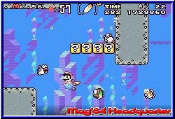 Weiterer positiver Punkt ist oben im Screen in der Mitte eine Art Ablage. So kann Mario Power Ups sammeln. Zumindest einmal. Hat Mario einen Pilz aufgenommen und findet einen weiteren wird dieser oben in dem Fenster aufbewahrt. Läßt sich Mario treffen fällt der oben herunter und Mario kann ihn nutzen. Auch gewollt geht dies mit der Select Taste. Etwas das auch später im Spiel die Spielbarkeit heben sollte. Hat man z.b. ein Level geschafft kann man es natürlich immer wieder besuchen. Vorteil ist aber das man einfach schnell in ein Level geht, sich ein leicht erreichbares Power Up holt und per Pausenmenu wieder auf die Karte kann ohne das Level nochmal spielen zu müssen. Das gleiche auch bei Extra Leben, das ebenfalls in geeigneten Leveln so immer wieder geholt werden können. Hiermit wird die fehlende Lebensleiste entschärft. Die Level selber sind von leicht bis sauschwer designt und bieten jedem Jumper Spieler alle Facetten des Genres, die teilweise von den Mario Spielen auch definiert wurden. Ziel in den Leveln ist es einen Art Balken am Ende zu erreichen. Dieser fährt immer nach oben und unten. Trifft man den Balken, was nicht unbedingt erforderlich ist bekommt man dafür Punkte, die Bonusspiele ermöglichen. Aber auch andere Dinge sind in den Leveln zu finden. Drachen Münzen, die wieder in fester Anzahl vorhanden sind gibt es. Dazu viele Anzeigen. Auch eine Zeit Anzeige. Jedes Level beginnt mit einer verschieden großen Zeitanzeige die Rückwärts läuft. In dieser Zeit muß der Spieler das Level abschließen. Was aber kein Problem ist im Normalfall. Sinn ist der Highscore, der sich aus vielen Punkten zusammensetzt. Unter anderem wieviel Zeit vorhanden ist am Ende. Dazu beim erledigen der Gegner durch draufspringen oder die Feuerattacke. Desweiteren durch die Drachenmünzen und das einsammeln von normalen Münzen, die bei bestimmter Anzahl auch Extra Leben bringen. Das Scrolling in den Leveln ist fließend und nicht Screen für Screen, was auch eine flüssige Spielbarkeit erlaubt. Dabei wird alles genutzt was das Genre hergibt. Plattformen, Gegner, Röhrenwege, Geschicklichkeitspassagen, die ein genaues Timing erfordern, Wolken Gehüpfe und natürlich die Unterwasser Action. Überall ist der Spieler Herr über die Steuerung. Geht doch was schief weiß man wem man die Schuld geben muß. ;-) Pro Level gibt es einen Rücksetzpunkt, der ebenfalls mit einem Balken definiert wird. Auch hier spielerisch schön gelöst. Hat man einen Rücksetzpunkt erreicht und geht danach drauf geht es zunächst auf die Levelkarte. Man kann jetzt in ein anderes Level gehen und sich aufpowern. Geht man dann wieder in das aktuelle zurück beginnt man nach wie vor am Rücksetzpunkt. Seine Premiere feierte in diesem Game der gute Yoshi. Ihn findet Mario ebenfalls unter speziellen Fragezeichen blöcken.