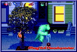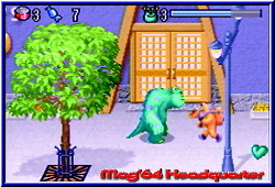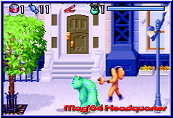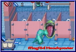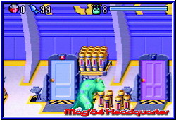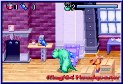 im Himmel fühlen. Nach Atlantis und Harry Potter bekommt auch der nächste Familientaugliche Film seine Spiele. Auf mehreren Plattformen erhältlich dürfen sich Nintendo Jünger auf dem GBA und dem GBC über eine Umsetzung freuen. Die knuffigen Charaktere der Monster AG sollen Disney nun endlich wieder zur Nr.1 machen. Shrek, den ich für einen der genialsten Filme halte hat doch gehörig für Unruhe gesorgt im Disney Imperium. Wir Spieler schauen auf THQ, die uns mit den beiden Versionen beehren. Den Anfang macht die GBA Version, die sich inhaltlich durch die Lizens an den Film hält. Hintergrund ist ein kleines Mädchen, das irrtümlich in die Monster AG gelangte. Verursacher ist der gute Sulley, der mit seinem animierten Fell schon im Kino für einige Effekte sorgte. Von nun an möchte er seinen Fehler wiedergutmachen und das Mädchen, dem er übrigens den Spitznamen Buh gegeben hat, wieder nach Hause zurück bringen. Dazu steht ihm eine komplette Reise durch Monstropolis bevor, in dem ihm Randall und seine Schwergen immer auf der Spur sind. Diese kleine Story im Spiel wird dem Spieler nach dem Einschalten in sehr schön gemachten Standbildern näher gebracht. Schön das mittlerweile so ziemlich alle GBA Games dies bieten. Das Hauptmenu enthält einzig den Spielstart, das Paßwort Menu sowie die Options für den Sound und die Credits. Wählt man den Spielstart an darf man aus 3 Schwierigkeitsgraden wählen. Danach beginnt das Game in einer kleinen Vorhalle, die aus normalen Türen und einer Exit Tür besteht und jeweils eine von 5 Welten definiert. Mit jeder weiteren Welt ändern sich die Anzahl der normalen Türen, welche die jeweiligen Level pro Welt beschreiben. Ziel ist es die Exit Tür zu betreten und den jeweiligen Endboss in die Knie zu zwingen. Dazu ist es aber notwendig die in viele kleine Stücke zerstörte Exit Tür zu komplettieren. Diese kleinen Einzelteile findet Sulley, den Ihr steuert in den normalen Türen und damit Leveln. Es ist egal in welcher Reihenfolge Ihr die Level durchspielt. Die Welten selber sind linear und können nur nach und nach gespielt werden. Die Monster AG ist ein reiner 1P Jumper, in dem Ihr die Rolle von Sulley übernehmt. Betritt man ein Level fällt die Final Fight ähnliche Engine auf. Ihr lauft also nicht nur durch reine 2D Welten, sondern könnt in einer schräg von der Seite Perspektive auch nach oben und unten laufen im Screen. Die Level sind in viele Räume und Etagen eingeteilt. In diesen sind nun verteilt die gesuchten Bruchstücke der Exit Tür verteilt. Mal müßt Ihr 2 davon finden, mal 3 und am Ende auch 4 pro Level. Die Räume und Etagen sind alle über Türen oder Treppen nach oben und unten verbunden. Um hier nicht den Überblick zu verlieren besitzt Ihr per Select eine Karte