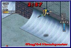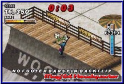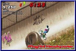 Dazu kann man sich von jedem Fahrer noch die Biografie anzeigen lassen und den fahrbaren Untersatz aussuchen. Hat man sich mit den Fähigkeiten und akrobatischen Fertigkeiten seines Favoriten auseinandergesetzt, sollte man sich nicht lange bitten lassen und den Karriere Modus in Angriff nehmen. Hier muß man sich nicht nur zur Schau stellen und gut aussehen, sondern 9 unterschiedliche Aufgaben innerhalb des Levels lösen. Dazu gehören den Highscore knacken, und Superstar Challange, Mirra Challange und die obligatorischen Spraydosen sammeln. Diese Aufgaben sind in allen Leveln gleich. Doch dazu kommen noch andere, die sich Levelspezifisch geben. Das können Moves sein, die sich nur in diesem Level machen lassen, über Trucks springen, auf einer bestimmten Anzahl an Schienen riden u.s.w. Für jede gelöste Aufgabe gibt es dann Punkte und für das komplett gelöste Level auch noch einmal. Mit diesen Ext. Points kann man dann das nächste Level freischalten. Je höher der Level ansteigt, um so mehr Punkte werden dafür verlangt, so das man schon fast alle Aufgaben der vorigen Level gelöst haben muß. Das man mit den einzelnen Moves in zwei Minuten nicht den Hauch einer Chance hat, den Highscore zu knacken, liegt auf der Hand. Combos müssen ran und zwar richtig fette. Man sollte gar nicht glauben, was alles möglich ist. Man muß nur genug Speed haben und hoch genug über die Rampe kommen. Dann sind Combos im Bereich der 15000 Pkt (und sicherlich noch mehr) drin. Doch Punkte sind nicht alles. Auch fahrerisch sollte man sein Bike bewegen können, da sonst manche Aufgaben unmöglich werden. Wer dagegen sein Bike einwandfrei beherrscht, für den werden die Missionen nicht das Problem. Im Screen werden euch die relevanten Dinge angezeigt. Die Zeit ist der Feind Nummer 1. Deswegen seht ihr sie fett in der Mitte am oberen Bildrand. Links daneben sehen wir die erreichten Punkte und die Speedanzeige. Legen wir eine Reihe Moves ohne Sturz hin, füllt sich die Anzeige und man kann nun die Special Tricks der Fahrer aus dem Ärmel schütteln. Stürzt man aber, ist die Anzeige wieder leer und man darf von vorn beginnen. Wenn du auf einer Mauer oder Schiene „grindest“, erscheint im Bild die Balanceanzeige, die du mit dem Steuerkreuz ausbalancieren kannst. Geht diese Anzeige in den roten Bereich, fällst du um, wie ein Sack. |
