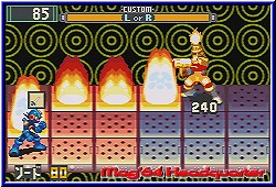Denn jetzt steuert Ihr den Helden über futuristisch anmutende Bereiche, Wege und Passagen immer auf der Suche nach Aufgaben, Gegnern und Rätseln. Diese bestehen meist im besiegen kleinerer Endbosse und vieler normaler Gegner dazwischen. Hier wird das das ganze wie in Pokemon gestaltet. Ihr läuft nach wie vor in der schräg von oben Sicht bis Ihr auf Gegner trefft. Das Bild wird dunkel und eine 2D Arena erscheint. Diese ist zunächst in 2 Teile geteilt. 9x9 Felder liegen sich gegenüber, wobei Mega Man alle 9 linken Felder nutzen kann und die Gegner die rechten 9 Felder, die sich auch farblich unterscheiden. In diesem Modus besitzt unser Held auch alle Eigenschaften eines RPG. Er hat eine Levelstärke, Fähigkeiten in Sachen Angriff oder Verteidigung und natürlich zahlreiche Hilfsmittel in Form von Aktionen, Waffen und Moves. Ziel ist es in jedem Kampf alle Gegner zu erledigen. Dabei besitzen diese wie auch Mega Man einen HP Wert der über den Gestalten zu sehen ist. Ihr müßt nun versuchen diesen Wert auf 0 zu bringen. Jetzt beginnt so langsam der Tiefgang des Spiels. Es gibt im gesamten Spiel 175 verschiedene dieser Aktionen, Waffen oder Moves, von denen Ihr zu beginn nur knapp 10 besitzt. Hier im Spiel auch Chips genannt. Das können Bomben sein, Mehrfachgeschosse, Laser oder Schwerter. Jedes dieser Dinge hat einen Angriffswert. Die Bombe z.b. 50, die einem Gegner wenn man ihn trifft diese Zahl abzieht. Innerhalb der 9 Felder könnt Ihr Rockman steuern, sowie auch die Gegner versuchen durch umherlaufen euch zu treffen oder auszuweichen. Es gibt auch feststehende Gegner wie Geschütze, die zumindest so relativ leicht zu treffen sind. Kommt es zum Kampf besitzt Ihr oben eine Energieleiste die sich nach jeder Aktion auffüllt. Ist sie voll könnt Ihr per L oder R Taste das Aktionsmenu aufrufen. In diesem Aktionsmenu stehen euch nun jedesmal diese Waffen (Chips) zur Verfügung. Dabei wählt man eine aus, von der man sich Erfolg verspricht und kann sie dann einmal anwenden. Es gibt dabei Unterschiede. Artverwandte können mehrmals gleichzeitig genutzt werden, während verschiedene erst später funktionieren. Anfangs könnt Ihr aus 5 verschiedenen auswählen, was sich mit der Zeit auf 15 ausweitet. Gehören die Aktionen zur gleichen Klasse wie z.b. verschiedene Arten von Bomben könnt Ihr auch mehrere auf einmal auswählen. Die ersten Gegner sind noch relativ leicht. Selbst Mega Man's Standardgewehr was Ihr immer nutzen könnt reicht meist aus. Habt Ihr die HP aller Gegner auf 0 gebracht ist der Kampf vorbei und eine Wertung erfolgt. Je nach Schnelligkeit, wobei wirklich die Zehntel Sekunden eine Rolle spielen bekommt Ihr eine Belohnung. Das können die Zenny's sein, die Geldwährung in allen Mega Man Spielen oder aber neue Aktionen oder Upgrades derselben. |