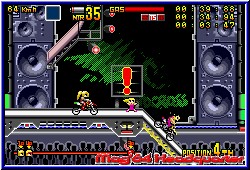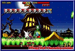Schlägt man sich erfolgreich, bekommt man nach dem Sieg im Saphir Cup Dave, den Bullen und nach dem Diamanden Cup Omega, den Roboter freigeschaltet, so das sich das Fahrerlager auf 8 steigert. Der Renn Modus beinhaltet das Zeitfahren auf allen freien Strecken und das Punkterennen. Hierbei muß man farbige Münzen einfahren, deren Wertigkeit unterschiedlich ist. Am Ende wird dann alles zusammengerechnet und mit den Stürzen unterwegs verrechnet. Doch der Renn Modus ist wie der Action Modus nur spielerische Beigabe. Hier kann man nichts freifahren oder sich in einer Highscore Liste eintragen - eben nur Just for Fun. Der Action Modus bietet drei Minigames zum Zeitvertreib. Bei der „Bombenjagd“ muß man in der Zeit seine Mitspieler loswerden, die „Zombiejagd“ verspricht fette Punkte für jeden überfahrenen Untoten und im Labor muß man schlicht Sterne sammeln. Im Multiplayer können bis vier Freunde die Mopeds anschmeißen. Mit einem Modul stehen allerdings nur der Action Modus zur Verfügung, während mit vier Modulen die Meisterschaft einen völlig neuen Charaker bekommt. Damit schafft der Multiplayer viel Spaß und richtige Spannung unter den Meisterschaftsteilnehmern. |
