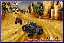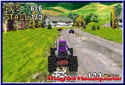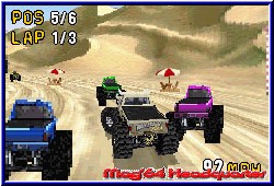 Man kennt ja mittlerweile einige Racer auf dem GBA und ihre technische Umsetzung. Was Monster Truck Madness hier bietet gefällt mir teilweise besser als V-Rally 3 auf dem GBA. Eine Pseudo 3D Engine, die massive Höhenunterschiede bietet sowie eine äußerst saubere und schnelle Engine. Dazu das vielleicht größte Highlight - 3 Viewpoints. Neben einer nahen Kamera welche die Fahrzeuge sehr detalliert wiedergibt darf aus einer entfernten höheren Variante gefahren werden und einer Motorhauben Variante, die auf dem GBA sehr gut rüberkommt. Großes Kompliment an die technische Umsetzung die so auf dem GBA noch nicht zu sehen war. Relativ breite Strecken und vor allem die Möglichkeit auch mal abseits der Strecken zu räubern machen einen großen Spaßfaktor aus. Man eckt wenn wirklich erst wieder an den Bäumen oder Bergen an den Seiten an. Dazu Hindernisse auf den Strecken die vor allem eines erfordern, einen guten Umgang mit der Steuerung. Auch hier gibt es Lob. Eine Arcade Steuerung, die Driften zuläßt und weiches Einlenken je nach Intensität des Drucks auf dem Steuerkreuz. Gegenlenken, das Austangieren von Sprüngen und Landungen, je nachdem wie man aufkommt erfordern gutes Geschick, was sich aber gut bewerkstelligen läßt. Je nach Untergrund steuern sich die Wagen auch verschieden. Sand, Schlamm oder Asphalt und man muß immer ein wenig anders steuern. Gefällt mir aber sehr gut. Auf den Strecken verteilt sind kleine Power Ups, ähnlich dem Mario Kart System. Beschleuniger, Power Up's um die Gegner zu schrumpfen oder kurzzeitig außer Gefecht zu setzen sind eine sinnvolle Zugabe. Die Weitsicht ist mit der entfernten Sicht sehr gut. Da die Engine eben Pseudo 3D ist und nicht wie bei vielen Spielen dieser Art die Strecke aus einer festen horizontalen Linie unter euch generiert. Ihr fahrt im Endeffekt wie auf einer Heimkonsole. Auch der Grafikaufbau der Seitenbegrenzungen, was auch ein V-Rally teilweise noch bot sieht man hier nicht. Dadurch wirkt alles eine Spur edler und ausgereifter. Die KI der Gegner darf man als gut bezeichnen. Im einfachen Modus fahrt Ihr allen eigentlich gut davon. Im Medium Grad merkt man schon ab und zu das man doch etwas mehr tun muß als nur passiv durch die Gegend zu fahren. Und im Hard ist die Anforderung immer 1. zu werden fast schon zu viel des Guten. Was sich auf die Spielzeit positiv auswirkt, ohne zu frusten da man es immer wieder gerne neu versucht. Neue Fahrzeuge die man freischaltet erhöhen die Motivation es dann doch zu schaffen. Die Strecken selber sind auch angenehm lang. Runden von 2 Minuten habt Ihr locker mit dabei, wobei eure Fahrweise dies natürlich auch beinflußt. Gelungenen Streckendesigns sorgen für Fahrspaß. Eine wirklich runde Sache, die im Time Trial ihre Fortsetzung findet. |