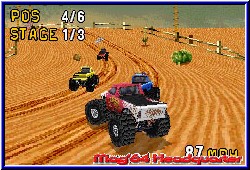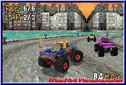 Schon interessant welche Firmenlogos man so mit der Zeit auf seine Nintendo Screens bekommt. War damals beim ersten Sega Logo schon ein schmunzeln angesagt ist dies heutzutage bei Microsoft nicht anders. Mit Monster Truck Madness kommt wieder so ein Spiel auf den GBA. Zwar ist das Spiel nicht von Microsoft entwickelt, kommen sie halt doch alle irgendwann auf den GBA. ;-) Hinter Monster Truck Madness für den GBA steht die australische Softwareschmiede Tantalus um die es ja in der Vergangenheit einigen Wirbel gab. In Sachen GBA sind sie nun schon alte Hasen, was sie auch hier wieder unter Beweis stellen. Das sie Rennspiele technisch auf dem GBA hinbekommen, haben sie mit ATV Quad Power Racing gezeigt. Die Engine mit verschiedenen Viewpoints ist von V-Rally ausgenommen immer noch einmalig. Mit Monster Truck Madness haben sie es geschafft dies nochmal zu verbessern und diesmal auch den spielerischen Aspekt nicht zu vergessen. Das leider nur für einen Spieler gemachte Game kommt komplett englisch daher bietet einen Batteriesave in dem man 3 verschiedene Spielstände sichern kann. Das Hauptmenu bietet zunächst 4 Menupunkte. Die sogenannte Instant Action, was im Endeffekt nichts anderes ist als ein schnelles Rennen. Dazu der Race Modus, der Time Trial und die Options. In diesen findet man neben den Soundeinstellungen und den Credits die Rekorde Abteilung um für alle Strecken und Schwierigkeitsgrade die erfahrenen Time Trial Zeiten nachlesen zu können. Um dort aber alles nutzen zu können muß im Race Modus erst alles freigefahren werden. Wählt man diesen Punkt an gelangt man zur Fahrzeugwahl. 4 anfänglich frei verfügbare und 6 zunächst abgedunkelte Fahrzeuge stehen euch zur Verfügung. Alle besitzen ihre speziellen Eigenschaften in Sachen Speed, Beschleunigung oder dem Gewicht und kommen durch die Lizenz im Original Aussehen und Namen daher. Einen Grave Digger oder Mad Dog gibt es ja auch in der Realität. Einmal ausgewählt warten danach die einzelnen Rennen. Es gibt 3 Schwierigkeitsgrade mit je 10 Strecken. Dabei ist am Anfang nur der leichteste Grad und wenige Strecken anwählbar. Alles weitere muß erst erfahren werden, wobei man hier die schwerste Vorgabe nimmt. Ihr müßt in jedem Rennen 1. werden um weitere Strecken und später auch Fahrzeuge freizuschalten. Erst wenn Ihr einen Schwierigkeitsgrad freigefahren habt, ist erst der nächste nutzbar. Die 10 Strecken teilen sich in 3 Varianten ein. Rundenkurse mit je 3 abgeschlossenen Runden, Rally Strecken, die Ihr von Punkt A nach Punkt B fahrt und die Arenen, die mehr einer Stadionrunde ähneln. Auf allen Strecken gleich ist die Anzahl der CPU Gegner mit 5, die Ihr schlagen müßt. Beginnt ein Rennen darf der geneigte GBA Racer erstmal große Augen machen.