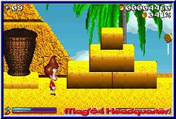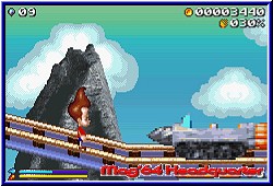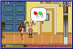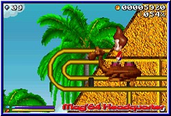 Denn gerade die erforderlichen Dinge sind gut versteckt. Die Steuerung ist gelungen und unspektakulär. Ordentliches Sprungverhalten zeichnet das Spiel aus, was keine Probleme bereitet. An Möglichkeiten um die Teile zu finden mangelt es beiden nicht. Neben den üblichen Dingen wie Klettern, Springen oder Kriechen haben beiden eine eigene Varainte eines Jet Packs. An entsprechenden Tankstellen aufgefüllt könnt Ihr durch drücken der L Taste fliegen. Allerdings nur solange wie der Vorrat reicht. Wie zur Lebensanzeige rechts unten gibt es links unten auch eine Tankanzeige für die Fluggeräte. Dazu noch eine Anzeige für kleine Pfeile die beide schießen können. Dabei sind dies Schrumpfpfeile. Getötet wird in diesem Spiel niemand. Die Gegner werden geschrumpft und sind somit aus dem Weg. So zahlreich sind diese aber nicht, weshalb Gegner das kleinere Übel sind. Das sind die Teile die man finden muß. Man muß die teilweise in mehrere Abschnitte eingeteilten Level gut durchsuchen um alles zu finden. Vor allem weil Jet Pack Stationen nicht unendlich vorhanden sind. Was dabei gefällt ist die technische Seite des Spiels. Grafik wie Engine sind ordentlich. Klar und ohne Mängel kommt der Spieler klar. Sauberes Scrolling ohne das weltbewegend neues auf dem GBA zu sehen ist. Aber es gibt wesentlich schlechteres. Der Sound ist mir dagegen teilweise etwas zu langweilig und wiederholt sich zu oft. Auch Umgebungsgeräusche sucht man lange. Hier wäre mehr drin gewesen. Schön sind dann wieder kleine Abhängigkeiten. So kann man bestimmte Bereiche nur mit kleinen Hilfsmitteln finden wie Rummelplatzbahnen oder kleinen Loren. Oder es gilt Wege zu finden in einem Meer aus bröckligen Steinen, die zu Beginn alle gleich aussehen. Erinnert ein wenig an Wario Land. Spielerische Abwechslung vom Jumper Part gibt es auch. Schafft man die komplette Stadt Retroville geht es per Rakete zum Mond und Planeten der Aliens. Diese Reise spielt Ihr auch. Hier in einer Rakete fliegt Ihr wie in Crash oder Spyro in den Screen hinein, das der GBA ja nun bewiesenermaßen gut kann. Dabei weicht Ihr Geschossen aus und zerstört gegnerische Geschütze. Leider nur zu kurz und zu einfach. Landet Jimmy dann auf dem Planeten der Aliens, beginnt die Abfolge ähnlich wie in der Stadt. Ihr sucht nach Leveln im Adventurepart, die wieder durch Fähnchen gekennzeichnet sind und löst diese nach dem gleichen Schema wie in Retroville. Hier nun komplett mit Robbie dem Hund. Grafisch andere Umgebungen gilt es wieder Dinge einzusammeln ehe man ein Level verlassen kann. Nach jedem Level gibt es ein Paßwort. Kritik gibt es für andere Mängel. Z.b. das es keine Rücksetzpunkte gibt wenn man seine gesamte Lebensenergie verliert. Hat man schon einiges eingesammelt ist das äußerst ärgerlich. |