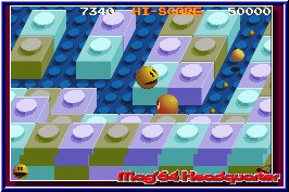 Beginnt man das Spiel nun, muß man versuchen, die Pac - Points auf dem Spielfeld zu vertilgen. Man benötigt lediglich das Steuerkreuz um Pac-Man die Richtung vorzugeben. Nur bei Pacmania beherrscht Pac-Man auch das hüpfen, was sich als überaus Vorteilhaft herausstellte. Nun schaufelt Pac-Man jede Menge Pac-Points in sich herein, bis die kleinen Geister auftauchen und dem treiben ein Ende machen wollen. Diese Geister lassen sich nur mit den Energie Kugeln vertreiben, die in jeder Ecke des Spielfeldes liegen. Damit lassen sich die Geister in die Mitte des Spielfeldes katapultieren und man hat wieder etwas Zeit gewonnen. Sind alle Pac-Points gegessen, ist das Level vorüber und man kommt zum nächsten. Um die Punktzahl in die Höhe zu treiben, erscheinen hin und wieder Früchte und Gegenstände auf dem Spielbrett, die Pac-Man auch vertilgen kann. Je höher der Level ist umso höher werden auch die Punktzahlen, die diese Gegenstände wert sind.
