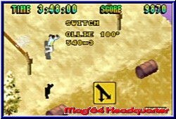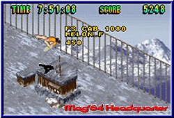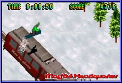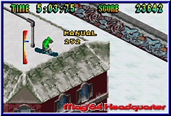 Hier wird die Hardware des GBA wieder gut gefordert. In dem Hinter dem Boarder Viewpoint fahrt Ihr in die Tiefe des Screens und müßt in der Pipe hin und her fahren, im richtigen Moment abspringen und Moves vollführen was die Bude hergibt. Dazu muß man vor Ablauf der Zeit das Ziel erreichen, was meist das größte Problem ist. Schön ist hier die Zugabe kleiner Bonusschilder rechts und links in der Luft neben der Pipe. Erwischt man sie in der Luft bekommt man deren angegebene Wertigkeit gutgeschrieben. Das macht echt Laune, hat aber meiner Meinung nach ein zu kurzes Zeitlimit. Groß rumlümmeln und viele Stürze und man kann eigentlich von vorn beginnen. Von Beginn an nur 2 Orte frei anwählbar müssen die anderen erst über die Sponsoren freigespielt werden. Im Falle von Aspen aber vor allem grafisch sehr gelungen. Hier muß man den Entwicklern viel Liebe zum Detail bescheinigen. Die Hintergründe der Berge wirken edel und verstärken den Umgebungseindruck der Piste. Auch auf der Piste gibt es jede Menge Dinge, Seilbahnen, mitfahrende Boarder, Häuser, Kegel oder Kisten samt Bäumen und natürlich Buckelpisten. Hier darf der Spieler vieles nutzen. Die Sprünge sind teilweise sehr hoch angesetzt, reichen aber trotzdem nicht um 15 Tricks zu machen. Aufwirbelnder Schnee machen grafisch ein feines Spiel, das aber nicht ganz die Effekte eines Tony Hawk besitzt. Der Sound ist wie schon angesprochen stimmig und passend und unterstützt ebenfalls die Action im Schnee. Ein Spiel das mehr Übung erfordert als Tony Hawk, und sich damit mehr an die Hardcore Zocker wendet. Das freispielen der Locations und versteckten Boards hält die Motivation hoch. Eine passende Grafik und gelungen Renn- und Half Pipe Modi, die im Falle der Pipe nur einen höheren Zeitrahmen haben sollten. Wer Tony Hawk geliebt hat, wird auch hier seinen Spaß haben. Schnelle Erfolge gibt es aber nicht. Übung ist hier das A und O.