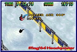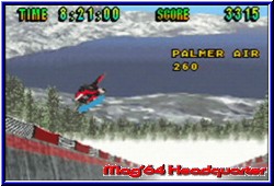 Verbesserungen der Stats gibt es nur durch erspielen neuer Boards. Ziel im Spiel ist es auf allen Strecken und Pipes Sponsoren zu finden. Es geht also nicht um Geld oder andere Dinge. Die Anzeige wieviel Sponsoren Ihr erfahren habt steht auf dem Level Select Screen. Positiv schon im Tutorial Modus ist das komplett eingedeutschte Spiel. Das Spiel verfügt über 4 Original Locations wie Aspen oder Heavenly, was aber nur den wenigsten ein Begriff sein dürfte. Die 4 Orte sind in verschiedene Spielmodi eingeteilt. Das Beginnt beim Freestyle Modus, geht über die Palmer X Rennen bis zur Superpipe, was technisch beindruckend ist. In allen Modis müßt Ihr nach Zeit, meist 4 Minuten Aufträge erfüllen, die im Tony Hawk Stil vor dem Rennen angezeigt werden. Im Freestyle Modus sind dies Scoregrenzen, das Wort BOARD zusammenzusetzen und spezielle Tricks auszuführen. Im Palmer X Modus, das einem Rennen gleicht gilt es gegen die 3 anderen in einem Rennen zu bestehen. Wie im Contest in 1080 gilt es die Strecken von A nach B zu fahren und dabei Fahnen zu umfahren und möglichst als erster anzukommen. Angenehm schnell was den Game Speed angeht sollte man mindestens 3. werden um 1 Sponsor zu bekommen. Gewinnt man bekommt man derer 3. Es gilt Abkürzungen zu finden und Abgründe, sowie über Geländer Becken zu überqueren. Man kann Gegner rempeln, liegt aber meist selber flach. Mit gedrückter R-Taste muß man meist mehrmals fahren um die Locations der Fahnen zu finden und von welcher Seite man sie umfahren muß. Macht aber Spaß und ist im Duell Modus auch zu zweit möglich. Der Freestyle Modus auf denselben Strecken verlangt ebenfalls das absuchen der Strecken, die recht weitläufig sind und gleichzeitig das Moven. Hier zeigt das Spiel einige Schwächen für den Gelegenheitsspieler. Wie bei vielen Spielen gibt es Bonus und Multiplikatoren für mehrere Sprünge in der Luft. Allerdings ist das Timing schwer hinzubekommen und erfordert einiges an Übung. 1-2 Sprünge sind nicht das Problem, bringen aber in Anbetracht der hoch gesteckten Score Grenzen kaum Punkte. Wie man laut Handbuch 15 Tricks hintereinander machen soll ist mir ein wenig schleierhaft, oder ich habe die Stelle noch nicht gefunden wo das geht. Wie immer ist die Landung das haarigste am Spiel. Vor allem wenn die Sprünge klappen und man eigentlich ein gute Kombo hinbekommen hat. Dann nämlich kann es sein das der Spruch "schlampige Landung" erscheint und Punkte wieder abgezogen werden. Das kann durchaus nerven. Übung ist hier Pflicht. Auf jeden Fall nicht wie bei Tony Hawk, wo man doch recht schnell gute Ergebnisse hinbekam. Hier ist das Game wesentlich schwerer. Erinnert mehr an den 3er auf dem GBC. Geil finde ich den Pipe Modus. |