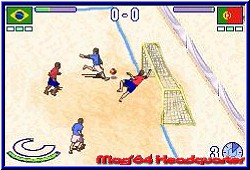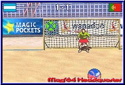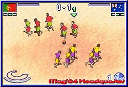 Dazu kann man die R-Taste einsetzen. Hält man die gedrückt kann man per B-Knopf einen hohen Paß spielen, während die A-Taste nun einen harten Paß ergibt. Hält man mit dem Ballführenden Spieler die L-Taste gedrückt so jongliert er diesen auf dem Knie. Jetzt kann man entweder den A-Knopf drücken und der Spieler macht selbsständig einen Seitfallzieher. Drückt man den B-Knopf gibt es ebenfalls einen hohen Paß. Der Spieler zu dem dieser Paß gelangt kann nun schon in der Flugphase des Balles den Schußknopf drücken oder den Paßknopf. Beim Paß geht der Ball sofort weiter, während beim Schuß ein extrem genialer Rückfallzieher die Folge ist. Hier haben sich die Entwickler in's Zeug gelegt. Schönere Animationen für einen solchen Torschuß gibt es nicht auf dem GBA. Das kommt so schon richtig dynamisch rüber. Perfekt wird es dann wenn man alle Varianten gut beherrscht. Schnelle Pässe und vor dem Tor eine dieser akrobatischen Aktionen und Tore fallen am Fließband und eines sieht schöner aus als das andere. Gerade in der Offense spielt sich das Game so sehr schnell und flüssig. Dem entgegen kommt auch das nicht so große Spielfeld. Die Defense ist dagegen nicht so gut gelungen. Hier gefällt mir vor allem das träge zum Ball gehen der Spieler nicht. Liegt der Ball etwas entfernt dauert es einen kurzen Moment bis einer hingeht, den man steuert. Auch sind Fouls zwar möglich, klappen aber zu selten. Tackling ist auch möglich, sieht aber etwas unbeholfen aus. Hier spielt sich das Game entgegen der Offense wieder etwas träge. Schlecht ist dagegen die Torhüter KI. Selbst wenn der Ball fast vor ihm liegt geht er selten mal hin. Hält er den Ball nicht fest, so dauert es ehe er aufsteht und versucht doch noch einzugreifen. Abstaubertore sind so auf beiden Seiten keine Seltenheit. Erst im höchsten Schwierigkeitsgrad ändert sich dies. Hat man sich soweit eingefuchst stehen dem Spieler sehr viele Spielmodi zur Verfügung, die man teilweise erst noch freispielen muß. Anfänglich die Pro Soccer Tour, in der neben einer Art Vorrunde noch ein Endturnier gespielt wird. Dazu 4 Ligen und 4 verschiedene Cup Varianten. Spielen könnt Ihr mit einer von 38 Mannschaften, die auch versteckte beinhalten. Löst man die Tour bekommt man auch noch die Weltpokalturniere und die Weltmeisterschaft geboten, was in dieser Hinsicht für viele Spielstunden ausreicht. Das Spiel entwickelt dabei einen guten Lerneffekt, so das man immer besser wird mit der Zeit. Auch das Defense Gameplay ändert daran wenig mit der Zeit. Dazu ist das Offense Gameplay einfach zu spaßig gemacht. Erste Erfolge stellen sich ein und man möchte dann auch nach und nach alles gewinnen was das Spiel bietet. Gespielt wird auf verschiedenen Plätzen weltweit, die sich aber grafisch hauptsächlich nur in den Farbgebungen des Sandes unterscheiden. |