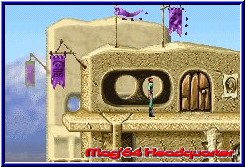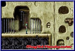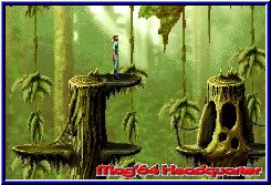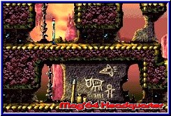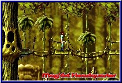 Drückt man im Laufen die A Taste springt Ben und hält sich automatisch an Felsvorsprüngen und Kanten fest. Das Timing muß recht genau sein, ist aber gerade richtig eingestellt. Mit der Zeit ist das kein Problem. Für kleine Sprünge reicht es in eine Richtung zu schauen und A zu drücken. Dann macht Ben auch ohne Steuerkreuz einen Satz. Allein die Steuerung macht aus dem Spiel teilweise eine Wissenschaft. Durchrennen und hopsen was die Beine hergeben könnt Ihr gleich vergessen. Das ganze wird so sehr anspruchsvoll. Vor jedem Sprung muß man schauen wo die nächste Kante oder Plattform ist. Dazu kommt ein Item und Waffenmenu das man ein wenig geschickter hätte lösen können. Oberhalb im Screen habt Ihr eine Anzeige. Rechts der Balken beschreibt eure Lebensenergie. Links der Balken zeigt euch an, sofern Ihr eine Waffe habt wieviel Munition vorhanden ist. In der Mitte sind kleine Felder, die zu Beginn noch leer sind. Sichtbar sind 3. Aufnehmen könnt Ihr aber mehr Items. Aktiv ist dabei immer das in der Mitte. Um zu wechseln scrollt man mit der L und R Taste zwischen den Items hin und her. Mit der Zeit wird vor allem das Waffenarsenal größer. Vom einfachen Messer bis zum Maschinengewehr ist alles dabei. Seid Ihr voll ausgerüstet erinnert das Spiel teilweise eher an Super Probotector als an ein Jump'n Run. Negativ ist das Ben nur springt wenn er kein Item aktiviert hat. Steht man also z.b. auf einer Plattform und sieht unter sich einen Gegner muß man runterspringen, mit B das Item oder die Waffe aktivieren und jetzt mit A nutzen. Hat man das nicht gleich im Griff kann man schnell das zeitliche segnen, da die gegnerischen Affen anfangs mit Knüppeln noch keine Gefahr sind, mit der Zeit aber ebenfalls mit MG's oder einer Pump Gun loslegen. Hier muß das Timing passen. Auch hier spielt man mit der Zeit vorsichtiger und überlegter. So blöd es klingt, aber das macht Laune und bietet im Jumper Genre eine angenehm anspruchsvolle Abwechslung. Dazu kommt der angesprochene stimmige Sound und eine sehr gelungene Grafik, die man von Spielen dieser Art auch nicht unbedingt erwarten kann. Lob an die Entwickler, die hier schöne detaillierte Hintergründe und Levelbauten erschaffen haben. Auch sind die Themen immer verschieden. Einzig die Wüste kann ein wenig verwirren, da Ben's Kleidung oftmals mit der Umgebung übereinstimmt. Wo isser?? ;-) Die Level sind im groben linear, bieten aber ab dem 4. Level viele Abzweige. Dazu kommen dann auch Rätsel in Form von Schalter, die dem ganzen noch ein Prise Adventure geben. Die Gegner sind hart aber fair. Leicht gemacht wird es euch nicht. Spielt Ihr aber überlegt und checkt die Möglichkeiten der Levelbauten aus sind oftmals ungefährlichere Möglichkeiten da um Gegner unschädlich zu machen. |