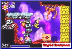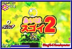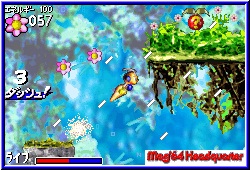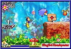 Trotzdem kann man auch Importspielern das Game empfehlen, da man durch ein wenig herumprobieren die Menus entwirren kann. Auf dem Hauptmenu kann man nun das Spiel starten, verschiedene Statistikbildschirme aufrufen oder sich die Briefings der einzelnen Level anschauen. Beginnt man ein Spiel bekommt man später nach jedem geschafftem Level ein kleines Resume über gefundene und erreichte Dinge. Beginnt das Spiel präsentiert es sich als reiner 2D Jumper, der allerdings eine Pseudo 3D Hintergrundgrafik mitbringt, die vor allem in den hinteren Leveln eine ungeheuer räumliche Wirkung hat. Grafisch sticht er Mario als Konkurrenz locker aus. Ich denke mal das sich Pinobee und Rayman zu Beginn der GBA Ära um die grafische Krone bei den Jumpern streiten werden. Startet das erste Level sind einige Bildschirmanzeigen auf dem Screen sehr wichtig. Unten links findet man Pinobee’s Lebensleiste. Ist diese leer beginnt man das Level von vorn. Dabei hat man zwar unendlich Continues, aber zumindest in der japanischen Version auch einen netten Bug. Verliert man nämlich die Energie kommt eine Abfrage ob man ein Continue innerhalb des Levels nutzen möchte. Beantwortet man die Frage mit JA kann es sein das danach der komplette Batterieinhalt gelöscht wird. Also heißt es zu negieren und über den Load Bildschirm das Level immer neu zu beginnen. Weiterhin gibt es oberhalb eine Blumenanzeige, wobei oberhalb die zu erzielende Anzahl angezeigt wird und darunter die erreichten. Diese kleinen Blumen findet man in jedem Level verteilt. Dabei verringert sich die untere Zahl sobald Pinobee sich bewegt und muß immer wieder aufgefüllt werden. Vor euch liegen insgesamt 9 Welten, die sich verschieden mal in 2 oder 3 Unterlevel einteilen. Die 9 Welten unterscheiden sich vor allem was ihre Größe angeht und natürlich in Form der Hintergründe und Grafikthemen, die weit über bekannt grüne Wiesenlevel hinausgehen. Was allen gemein ist sind die zahlreichen beweglichen Objekte, fahrenden Plattformen, wankenden Levelbauten und einer Menge an Gegnern. Ziel in jedem Level ist es ein Ausgangstor zu finden um das Level abzuschließen. Dach davor hat er Spieler einiges zu leisten, was hier vor allem in Form vieler Items vorhanden ist. Diese sind immer unter kleinen Beeren versteckt, die ein Fragezeichen beinhalten. Was Pinobee darunter findet ist sehr verschieden. Zum einen kann er Lebensenergie in 3 verschiedenen Wertigkeiten finden. Desweiteren gibt es Spezialitems die Pinobee Unverwundbar machen, und in 3 verschiedene Zustände verändern in mit denen er bestimmte Wege oder Aktionen öffnen und machen kann. |