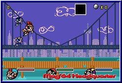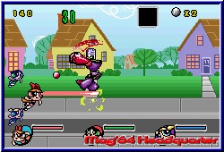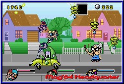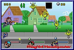Comic Figuren und die entsprechenden Games dazu. Mittlerweile nicht mehr wegzudenken aus dem Videospielgeschäft. Das gilt seit dem GBC auch für die Powerpuff Girls. Die 3 zarten mit ihren überdimensionalen Augen sorgten auf dem GBC aber weniger durch spielerische Qualität für Aufsehen, sondern weil sie damals gleich im 3er Pack erschienen. Jedes Girl mit eigenem Spiel. Auf dem GBA begnügte man sich mit einem Game, was auch völlig ausreichend ist. War das Spielprinzip auf dem Color eine Mischung aus Flugeinlagen und Jump'n Run dürfen hier R-Type und Phalanx geschädigte zum GBA greifen. Denn nichts anderes als ein Side Scroll Shooter verbirgt sich im Modul. Gleich geblieben ist dagegen die altbekannte Story gegen den Obermotz Mojo JoJo, der die Stadt Townsville in Angst und Schrecken versetzen will. Aber doch nicht mit unseren Powerpuff Girls...., und so tretet Ihr nun an Mojo und seinen Schwergen das fürchten zu lehren. Das Spiel bietet nach dem Einschalten die Modis Spielstart für die 1P Missionen, die Optionen für den Sound und die Credits, sowie den Multiplayer Teil für ungewöhnliche 3 Spieler Action. Das erste Game mit 3P Link Option. Wobei jeder sein eigenes Modul benötigt. Wählt der Spieler die Solo Missionen an liegen 5 Level plus Bonuslevel vor ihm. Was wenig klingt wird durch verschiedene Kriterien verlängert. Im Spiel das wie schon erwähnt von links nach rechts scrollt ist es eure Aufgabe alle 3 Girls durch das Level zu bekommen. Dabei steuert Ihr immer eine der 3, während die anderen beiden neben euch aber in der Luft mitfliegen. Per L-Taste kann der Spieler zwischen den Girls durchschalten. Der Vorteil dieser Variante ist die Möglichkeit bei fast leerer Lebensleiste eine andere anzuwählen. Alles live im Spiel. Jedes Level muß bis zum Ende gespielt werden um dort einen Endgegner fertig zu machen. Allerdings von Ultra Leicht bis sehr schwer. Den Engegnern hätte mehr Ausgewogenheit gut getan. Bis dahin stehen dem Spieler hektische Zeiten bevor. In diesen erwarten euch Unmengen an Gegnern. Zwar nur wenig unterschiedliche Varianten, dafür aber in hoher Anzahl. Sie unterscheiden sich zwischen Luftgegnern und solchen die vom Boden aus euch nach dem Rock trachten. Als Waffe besitzt jede der Girls einen Laser, der mit der B-Taste bedient wird. Auch Dauerfeuer ist möglich. Hier ist alles wie in diesem Genre, Gegner treffen und kleine Power Ups einsammeln. Alle Gegner hinterlassen kleine Kügelchen,die man tunlichst aufsammeln sollte. Denn in jedem Level muß man eine bestimmte Anzahl einsammeln um auch den Bonus zu bekommen. Um im Spiel weiter zu kommen sind sie aber nicht nötig. Das Problem an diesen Kugeln ist aber ein anderes. Geschosse der Gegner sehen teilweise diesen Kugeln recht ähnlich.