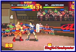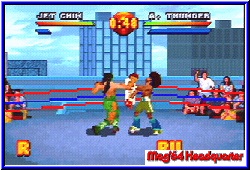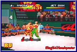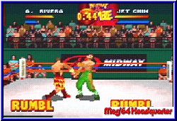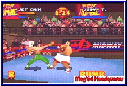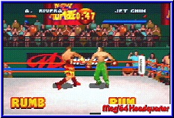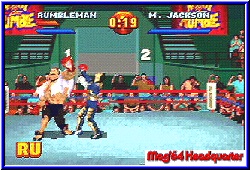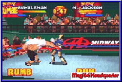 | In seiner unnachahmlichen Art stellt er die Kontrahenten vor und der Kampf beginnt mit dem berühmten „Let´s Get Readyyyyyyyyyyyyy to Rumble". Die unterschiedlichen Umgebungen fallen etwas spärlich aus, doch wen interessiert das schon. Man hat ja eh keine Zeit, die Umgebung zu begutachten. Im Bild sehen wir oben unter den Namen zwei Leisten, die sich verändern, wenn wir ein paar ordentliche Hiebe verabreichen (oder bekommen) und die Powerleiste ist unabdingbar bei Combos und kraftvollen Schlägen. Hat man einen fetten Punch gelandet, ist die Powerleiste kurzzeitig leer, füllt sich aber wieder, wenn wir nicht schlagen. Bei wirkungsvollen Punch´s erscheinen die bekannten Buchstaben unter unserem Boxer, die am Ende „Rumble" ergeben und damit läßt sich schon gut Schaden anrichten auf der Gegenseite. Setzt man die „Rumblefäuste" nicht gleich ein, verändern sich die Buchstaben bei weiteren harten Treffern. Erst werden sie dunkelrot und am Ende flammen sie auf. Kommen sie dann zum Einsatz, richtet sich unser Bedauern an den armen Gegner. Dann gibt es richtig was auf die Mütze. Man kann das erzeugen von Buchstaben auch forcieren, indem man mit der Select Taste spielt. Bei jedem drücken, erscheint ein Buchstabe. Nur leider mögen die Gegner das nicht und rücken euch auf die Pelle. Um euern Fighter fit für den Titel zu machen, muß er ein schmerzliches Programm absolvieren. Wenn wir also die Meisterschaft gewählt haben, kommen wir nach der Boxerwahl in das Menu, wo wir das Formen des Boxers überwachen und beschleunigen können. Hier erfahren wir alle Einzelheiten, angefangen beim Datum über die Platzierung, Kohle und Fertigkeiten des Boxers. Mit 2000$ ist euer „Kirmesboxer" keine große Leuchte, was man auch an seinen Werten für Stärke, Stehvermögen und Schnelligkeit sieht. Unten links sehen wir den termin für den nächsten Kampf und bis dahin sollten wir den Burschen wenigsten etwas hin bekommen. Dazu steuern wir die Nav. Leiste links an, wo sich zwischen Passwort, Verlassen, Preis- und Titelkampf auch der Punkt Training verbirgt. Nun müssen wir aus den 7 Trainingsmöglichkeiten die beste finden und umsetzen. Das Vitaminprogramm und die Rumblemasse lassen sich erst dann anwenden, wenn das nötige Kleingeld vorhanden ist. Die anderen Übungen kosten nichts, sind dafür auch nicht so ergiebig. So sorgen die „Rumble Pads" und der „schnelle Sack" für die Verbesseung des Speed´s, wogegen der „schwere Sack" und das Hanteltraining für Schlagpower sorgen. Unter dem Trainingsprogramm können wir gleich absehen, was die Übung bringt. Im folgenden Scheduler legen wir die Länge der Übung fest. |