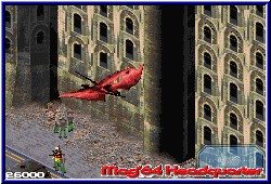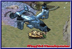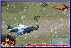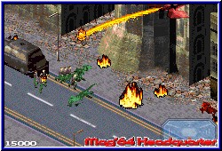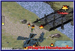 Mit dem B Knopf läßt man die ganze Truppe auf- und absitzen, wenn es die Situation erfordert. Ist die Panzerung der Fahrzeuge aufgebraucht, steht der ganze Trupp wieder mit den Beinen auf der Erde. Nun dirigiert man seine Leute durch das trostlose Gebiet mit Schluchten, brennenden Häusern, Getreidefeldern, Flüsse und Unmengen an Drachen. Diese verfolgen euch mit einer Penetranz und versuchen Mitglieder eures Trupps „abzufackeln“. Inwieweit ihnen das gelingt, verrät die Gesundheitsleiste am linken Rand des Screens. Oben im Bild kann man nachverfolgen, was unserseits das bekämpfen der Kreatur ausmacht und dessen Gesundheitsliste schrumpft. Ob es sich dabei um Baby-, Jungdrachen oder Erwachsene Drachen handelt, spielt keine Rolle, sie sind einfach nur nervig und gefährlich. Unterwegs findet man Kisten, die die Spielzeit bei Bedarf verlängern, Tonnen und Sandsäcke sowie Gesundheitspakete, die die Chancen unserer Leute erhöhen, das Ziel zu sehen. Man muß nicht mit allen Leuten die Mission bestehen, doch einer sollte wenigstens am Ende noch einen Funken Leben im Körper haben. Das zu erreichende Primärziel wird euch mit der Kompassnadel im Bild angezeigt. Diese zeigt leider nur den Direktweg dahin und schert sich nicht um Berge und Flüsse, die man nicht überwinden kann. Benötigt man zum Beenden der Mission noch weitere Utensilien, wie Treibstoff für den Heli oder Sandsäcke für die Bombe, zeigt der Kompass auch den Weg zum nächsten Zielobjekt. Nach erfolgreichen Beenden der Mission bekommt man einen kleinen Statistikeinblick und den Rang seines Erfolges, der von der Zeit und dem Rest der Truppe abhängt. Dazu ein Passwort, welches sich aus Zahlen, Buchstaben und Zeichen zusammensetzt und einen später den Einstieg an der verlassenen Mission ermöglicht. Grafisch macht das ganze nicht so viel her, es wirkt alles etwas fad. Auch das Feuer ist einfach auf die Oberfläche gepoppt und wirkt beim durchlaufen richtig fehl am Platze. Beide Steuerungsmodis lassen sehr zu wünschen übrig, was das anvisieren und bekämpfen der Gegner betrifft. Die Gegner selbst sind ja sehr zahlreich vorhanden, hören aber nie auf. Sie projezieren sich ständig neu ins Spiel und lassen so ein kontrolliertes Gebiets Check up nicht zu. Was man auch sehr vermisst ist eine Karte. Der Kompass ist ja gut und wichtig, aber die zerklüftete Landschaft verwirrt auch in späteren Leveln immer noch. Eine Orientierung fällt verdammt schwer. Ich denke man hätte noch einiges besser machen können und sollen. Ein Reißer ist das Spiel bestimmt nicht. |