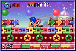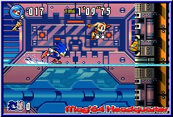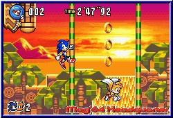 Alle Zonen werden nacheinander gespielt. Beginnt Ihr nun mit Sonic und Tails eine solche Zone ist Sonic der Charakter, den Ihr als Einzelspieler steuert. Tails und später jeder andere zweot gewählte fungiert als Helfer durch seine jeweilige spezielle Fähigkeit. Wer jetzt so spielen möchte wie gewohnt darf dies natürlich auch. Ihr bewegt Sonic mit dem Kreuz und könnt per A-Taste Springen und mit der B-Taste abstoppen. Das Leveldesign an sich deckt nun auch das alte Gameplay mehr als genug ab. Das heißt Loopings, Rampen, diverse Flippervarianten die Sonic auf das Tempo bringen das man kennt ist alles dabei. All dies im gewohnten Tempo ohne technische Probleme und mit der gewohnt verspielten und kunterbunten Grafik. Nur entdeckt man überall in den Zonen Orte die man selbst mit Sonic's Tempo nicht erreicht. Weiterhin wird so schnell deutlich das die Zonen von den Ausmaßen her immens geworden sind. Jetzt greift der 2. Charakter in das Geschehen ein. Im Falle von Tails besitzt dieser die Fähigkeit extreme Höhen für Sonic zu ermöglichen. Ihr stellt euch also vor einer hohen Kante auf und drückt die R-Taste. Jetzt läd sich Tails wenn man es einfach sagen möchte auf und kickt Sonic beim loslassen extrem in die Höhe. Ihr landet danach mit Sonic auf dieser Kante, während euch Tails automatisch folgt. Ihr ruft ihn wenn Ihr ihn braucht und kümmert euch ansonsten nur um Sonic. Wobei die kleinen Animationen, allein wenn Ihr beide mal eine Weile stehen laßt sehr schön geworden sind. Ein drängelnder Tails der Sonic durch Handzeichen zum weitermachen ermuntern will ist da nur ein Beispiel. Nun ist das aber noch längst nicht alles. Durch diese Möglichkeit viele versteckte Abschnitte in den Zonen zu erreichen werden weitere Inhalte nutzbar. Denn meist an diesen Orten versteckt sind zum einen Special Stages. Bonusbereiche, die technisch neues bringen. Denn hier wechselt die Sicht auf Sonic, die sich nun hinter ihm befindet. Z.b. steht Sonic nun auf einem Flugzeug und Ihr fliegt in den Screen hinein in Pseudo 3D Umgebungen. Ziel ist es dann meist nach Zeit Ringe einzusammeln, die ja bekanntlich Sonics Lebensenergie definieren. Verschiedene Varianten die Abwechslung in das altbekannte Gameplay bringen. Die zweite Variante ist noch gelungener und man fragt sich schnell wieviele Level, Zonen und Geheimpassagen dieses Spiel eigentlich bietet. Große Ringe in den Zonen bringen den Spieler immer in alternative Routen einer Zone. Komplett neue Umgebungen die so mehrere Wege zum Ziel beinhalten. Auch diese unzähligen Bonuslevel sind nicht ohne Sinn enthalten. Zum einen könnt Ihr nur so die wieder versteckten Emeralds finden und zum anderen mitten in einem Level den Charakter wechseln. Vielleicht das genialste Feature. Denn normal geht das nur vor dem reinen Spielstart.