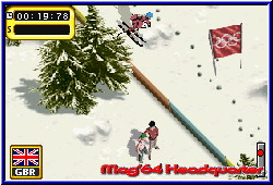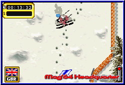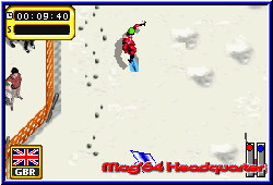 Es ist wieder soweit. Sportler aus aller Welt messen sich in Salt Lake City bei den Olympischen Winterspielen. Da mittlerweile kaum noch ein so großer Event ohne Spiel auskommt gibt es auch für uns Sessel Olympioniken die Möglichkeit in sportlichen Wettkämpfen anzutreten. Salt Lake 2002 ist der Name des Games das sich mit der Bezeichnung - Offizielles Spiel der Olympischen Spiele- schmücken darf. Auch der GBA ist bedacht und heimischem Daddeln steht nichts im Wege. Wie auch bei anderen Spielen wird der Spieler mit heroischer Musik und einen gut gemachten Vorspann begrüßt. Danach kann der Spieler entscheiden ob er allein spielen möchte oder mit bis zu 3 Freunden. Sehr schön ist dabei das für 2 Spieler nur ein GameBoy Advance ausreicht. Hier werden die Inhalte am gleichen Gerät nacheinander gespielt. Erst ab 3 Spielern benötigt Ihr mehrere GBA's samt Modulen und Linkkabel. Nach dem offiziellen Logo der Spiele geht es zum Hauptmenu das dem Spieler 5 Menupunkte zur Auswahl gibt. Angefangen beim Wettkampf Modus, dem Olympia Modus, über den Klassik Modus, den Optionen und dem sogenannten Zeit Modus, den man mit einem Time Trial vergleichen kann. Enthalten im Spiel sind 6 Disziplinen. Angefangen beim Ski Springen, dem Bobfahren, dem Slalom, der Abfahrt bis zum Snowboard Fahren und dem noch relativ unbekannten Eisstockschießen. Das mit Batterie ausgestattete Game bietet in den Optionen wichtige Punkte. Zum einen euer Profil das euch Namen und Land auswählen läßt. Dazu eine Trophäensammlung, die es für 5 Schwierigkeitsgrade gibt, was über die Dauer des Spielens einiges aussagt. Dazu kommen die Credits, die Sprachwahl und die Spieloptionen, die allerdings nur den Ghostmodus für den Zeit Modus enthält den man aktivieren und deaktivieren kann. Ziel im Spiel ist es natürlich in allen Disziplinen die Gold Medaille oder im Falle des Wettkampf Modus sogenannten Rosetten zu bekommen. Das wiegesagt in allen 5 Schwierigkeitsgraden. Um diese aber erstmal freizuschalten muß der Spieler im Klassik Modus einiges leisten. Zu Beginn ist überall nur der Anfänger Modus freigeschaltet. Im Klassik Modus spielt man nun alle 6 Disziplinen hintereinander und muß für den Anfänger Grad vorgegebene Scores und Zeiten überbieten. Alles muß in einem Ruck gespielt werden bei dem 3 Continues zur Verfügung stehen. Erst wenn der Spieler hier alles gewinnt darf er im Fortgeschrittenen Modus das gleiche tun, wobei nun die vorgegebenen Zeiten und Scores schwerer werden. Immer wenn man einen höheren Grad im Klassik Modus gewinnt darf er auch in den anderen Modis benutzt werden. Im Wettkampf Modus kann man jede einzelne Disziplin anwählen und spielt gegen 16 andere Länder.