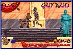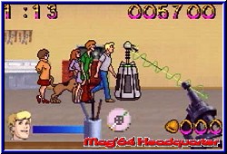 Und wieder erreicht ein Trickfilm Held den GBA. Diesmal schwingt sich Scooby Doo mit seinen Freunden auf, ein Abenteuer zu bestehen. Die alten Trickfilme mit ihrem eigenen Charme bilden hier die Vorlage das Games. Mit offizieller Lizens darf der Spieler die Gang durch ein Jump'n Run Abenteuer führen. Nach dem Einschalten steht im komplett deutsch gehaltenen Spiel die Wahl ein neues Spiel zu beginnen, einen alten Spielstand per Paßwort zu laden und in den Optionen den Sound und den Schwierigkeitsgrad anzupassen. Beginnt man ein neues Spiel geht es zunächst in einem Art Vorbereich, der hier schon als einzelnes Level zählt darum die restlichen 6 im Spiel enthaltenen Level freizuschalten. In diesen gilt es dem Obermotz des Spiels, dem sogenannten Virusphantom das Handwerk zu legen. Durch eine Erfindung ist es möglich mit einem Laser zwischen der Computerwelt und der realen Welt hin und her zu wechseln. Allerdings ging dabei es schief und das Virusphantom wurde befreit, das nun für Unruhe sorgt. Also übernehmt Ihr nun die Aufgabe dem guten zum Sieg zu verhelfen. Welch überraschende Story. ;-) Zu Beginn steuert Ihr einen der Gang, wobei die anderen wie z.b. Shaggy oder eben Scooby hinterher flitzen. Mit der L-Taste wechselt Ihr die Charaktere durch. Ziel ist es im Vorbereich den Laser zu aktivieren, der einen Charakter der Gang in das jeweilige Level beamt. Dazu benötigt man für jedes Level eine CD für den Laser. Davon findet man immer 2 auf einen Schlag und öffnet so immer gleich 2 Level im Hauptspiel. Nachdem man sich entschieden hat welcher der Gang Mitglieder spielen soll wird er vom Laser gebeamt und die Levelauswahl erscheint. Level die begehbar sind besitzen ein Häkchen. Dabei sind die Level in verschiedene aufgaben eingeteilt. Zunächst die Jumper Level, die allerdings recht einfach gehalten sind. Ziel ist es eine gewisse Anzahl an Items einzusammeln, über deren geforderte Anzahl Ihr immer links oben im Screen informiert werdet. Erst wenn diese Anzeige für die sogenannten Scooby Schmeckys auf 0 ist kann man im Level eine sogenannte Schmeckys Packung finden. Danach ist das Level Geschichte und eine Statistik erscheint die einen Highscore generiert. Im Anschluß gibt es das Paßwort und man befindet sich wieder im ersten Hauptbereich. Positiv ist das Feature das per Paßwort auch der Highscore mitgesichert wird. Seltenes Feature, das man sich bei ganz anderen Spielen gwünscht hätte. Die Jumper Level sind vom Aufbau her einfach gehalten. Normale Sprünge, Plattformen die sich bewegen oder hohe Baumwipfel wo man von Ast zu Ast springt. Man merkt sehr schnell das der Anspruch für ältere Spieler nicht sehr hoch ist. Gegner die im Level auftauchen kann an für kurze Zeit unschädlich mache oder ihnen mit einer Maske ausweichen.
