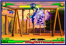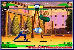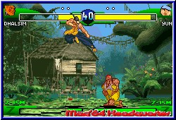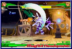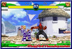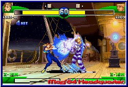 Das Training bietet euch die Möglichkeit das Verhalten des Gegners anzupassen um wirklich beim Urschleim anzufangen. In der Grundvariante bietet das Spiel bekannte Dinge. Neben 2 verschiedenen Varianten des Kick und Punch per L,R, A und B dient natürlich das Steuerkreuz entweder Solo oder in Verbindung mit einer Action Taste für weitere Aktionen. Das reicht von bekannten und einfachen Specials wie dem Hadoken von Ryu oder eben einfach nur dem Ducken, Blocken oder Springen was man über das Steuerkreuz regelt. Lob gibt es hier für das Handbuch, das zu allen Charakteren die entsprechenden Moves erklärt und die Ausführung darlegt. Neu sind ganz andere Dinge. Zum einen die Guard Leiste, die es dem Spieler ermöglich dadurch effektiver zu Blocken und dazu einen sogenannten Guard Crush auszuführen solange noch Energie in dieser Leister ist. Dazu kommt nun das Feature das bei Capcom VS SNK 2 schon interessant gelöst war. Ihr könnt jedem Kämpfer 3 verschiedene Kampfstile zuweisen, die man später vor dem Spielen wählen kann. Diese definieren die Art und Weise sowie die Häufigkeit der Special Combos eines Charakters. Alle 3 Varianten sind für die verschiedenen Kampfarten ausgelegt. Wer gerne in der Luft kämpft, per Konter zu Aktionen kommen will oder ganz normal kämpft. Unterhalb im Screen besitzen alle 3 Varianten verschiedene Anzeigen die es durch das eigene Kämpfen zu füllen gilt. Einmal gefüllt sind Bildschirmfüllende Combos möglich, die grafisch einen irren Eindruck hinterlassen. Vor allem dann wenn man mit einer solchen Combo den Kampf beenden kann. Was diese Combos wichtig macht ist das man teilweise Kämpfe nur damit gewinnen kann. Zumindest war dies mein Eindruck. Eine gute Beherrschung des ganzen ist also äußerst wichtig. Von daher sind die Möglichkeiten beim Kämpfen wesentlich zahlreicher als in Konkurrenzspielen. Unterstützt wird das ganze schon im Training von den wunderschönen Hintergründen, die man auch im Hauptspiel vorfindet. Hier zeigt das Spiel auch bei der Turbo 7 Variante was im GBA steckt. Schnelles Gameplay gepaart mit technisch perfekter Umsetzung und eingebettet in sehr detaillierte Umgebungen machen das Kämpfen so zum Vergnügen. Hat man sich im Training ausgetobt darf man den Single Modus als einziges anwählen. Erst wenn man hier erfolgreich gekämpft hat darf man weitere freischalten. Dabei zeigt das Spiel hier seine schwere Seite. Im Single Modus gilt es 10 Kämpfe hintereinander zu gewinnen. Verliert man einen Kampf kann man zwar durch unendlich Continues an der gleichen Stelle nochmal kämpfen, schaltet aber nichts mehr frei. Nur wenn man ohne Niederlage durchkommt darf man sich zum einen über einen Highscore freuen und zum anderen neue Modis spielen. |