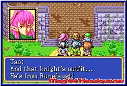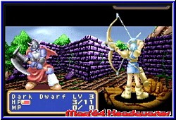 Je nach Klasse und Untergrund könnt Ihr verschieden weit laufen und agieren. In Shining Force ist sichtbar kein Höhenunterschied vorhanden wie z.b. in einem FFTA. Treppen, erhöhte Plattformen in dem Sinne gibt es nicht. Dennoch kommt taktisch der Umgebung eine Bedeutung zu. Ihr bekommt zu jedem Untergrund auf dem Ihr steht, also z.b. Wald, Feldweg oder Berg eine Anzeige wie gut der Untergrund zur eigenen Deckung ist. Greift euch ein Feind also auf einem Feldweg an, so hat er mehr Chancen als wenn Ihr im Wald steht. Die Gegner spielen in der Regel sehr abwartend und lauern eher auf euch, als das man euch sofort alles entgegenschickt. Ziel ist es meist alle Gegner zu erledigen oder den jeweiligen Boss. Können die meisten Charakterklassen nur die 4 Richtungsfelder um sich herum angreifen, so sind Fernwaffen wie Speere oder Bögen auch in der Lage nicht nur mehrere Felder entfernt zu treffen, sondern vor allem auch schräg, was mal was neues ist. Auch dadurch wird der taktische Aspekt gefördert. Um einen Gegner zu besiegen gilt es dessen HP Anzeige auf Null zu bringen. Stehen sich 2 Kontrahenten gegenüber wechselt das ganze in den Kampfbildschirm, der Golden Sun sehr ähnelt. Hier stehen sich aber nur 2 Gegner gegenüber. Allerdings grafisch noch schöner gelöst als in Golden Sun. Weniger was die Effekte der Attacken angeht, sondern der Grafik der Kontrahenten. Kleine Animationen, die hier sehr gefallen. Ist der Gegner erledigt verschwindet er vom Schlachtfeld und Ihr bekommt neben Geld natürlich Erfahrungspunkte. Diese gibt es auch bei Treffern die den Gegner noch nicht umhauen, nur beim kompletten Erledigen eben wesentlich mehr. Auch hier greift das FFTA Prinzip. 100 Punkte sind nötig um ein Level Up zu erreichen. Ist der Gegner im Level höher als Ihr gibt es maximal 48 EP. Gleichlaufend mit einem Level Up erhöhen sich die Werte diverser Eigenschaften des Charakters. Allein dies reicht um den RPG Fan in seinen Bann zu ziehen. Je mehr Charaktere um so besser wird das Spiel. Die Möglichkeiten sind einfach intensiver. Stoßtrupps bilden, einen Gegner einkesseln oder umlaufen. Durch die Größe der Karten ist dies alles möglich. Ist eine Schlacht vorbei wird die Geschichte weitererzählt und Ihr findet eine neue Location. Dort sucht man meist den Priester auf, der zum einen euren Spielstand sichert, was aber auch mitten im Kampf geht. Dazu kann er gefallene Charaktere heilen. Solange der Hauptheld in einer Schlacht nicht fällt könnt Ihr kämpfen. Die anderen sind also nicht verloren, sondern eben aus der Schlacht genommen. Jetzt kommt aber ein Feature das einen Großteil des Reizes in Tactics Ogre ausmachte. Zwar nicht so konsequent umgesetzt, aber immerhin. Erreichen die Charaktere ein bestimmtes Level kann man sie im Rang aufsteigen lassen.