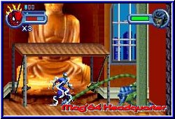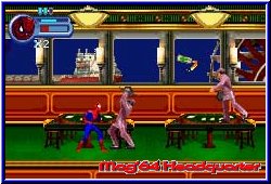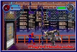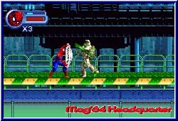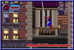 Was wäre die Spieleindustrie ohne ihre Lizensen und Superhelden die uns Spielern nun schon seit Jahren einen Daddeldaumen bescheren. Neben den X-Men hat Activision einen weiteren dieser Helden im Angebot - Spiderman. Dieser an allem kletternde und mit seinem feinen Faden schwingende Held ist auch in der Spielebranche kein Unbekannter. Auch Nintendo Spieler haben mit ihm schon reichlich Erfahrung. Nun wird also auch der GBA bedacht. Waren die GBC Titel als Vergleich eher Durchschnitt, so will Activision mit der GBA Variante groß auftrumpfen. Auch die GBA Version bringt natürlich eine Story mit. Unser Held Peter Parker alias Spiderman bekommt durch einen Telefonanruf von verschiedenen Ereignissen innerhalb New York's Wind. Wie er erfahren muß treiben dort die Schurken Rhino, Hammerhead und Big Wheel ihr Unwesen. Zeit für Spiderman sich auf den Weg zum machen um dort nach dem rechten zu sehen. Nach dem Einschalten bekommt der Spieler auch hier wie bei X-Men einen angenehmen Sound zu Hintergrundsound zu hören. Dazu wird die Story wie später vor jedem Level in gut gemachten Comic Bildern erzählt. Leider nur in Englisch, so das jüngere Spieler auf das Handbuch zurückgreifen sollten was die Story angeht. Das Hauptmenu bietet euch den Spielstart, einen älteren Spielstand per Paßwort zu laden oder den Sound anzupassen. Wählt man ein neues Spiel kann man den Schwierigkeitsgrad wählen, der hier in 3 Möglichkeiten vorhanden ist und vor allem im schwerer zu besiegen der Gegner liegt. Wie bei Final Fight oder den X-Men besitzt auch hier jeder Gegner eine Energieleiste, die je nach Schwierigkeitsgrad länger oder kürzer ist. Als erstes gelangt der Spieler zu einer Übersichtskarte von New York. Hier wird es euch freigestellt eines von 3 Leveln am Anfang anzuwählen. Dabei ist es egal mit welchem Ihr beginnt. Ziel in jedem Level ist es nach versteckten Power Ups zu suchen und am Ende einen der drei Oberbosse zu finden. Bis es soweit ist wird dem Spieler aber ein überraschend gutes Game präsentiert. Ich kann mich noch an die E3 Version erinnern. Diese war bei weitem noch nicht so gut spielbar wie die Final. So sollte es sein. Betritt man ein Level sieht man das Geschehen aus einer 2D Sicht. Gesteuert wird Spiderman mit dem Kreuz. Dazu kommen die A-Taste zum Sprung und B um einen Faustangriff zu starten. Eigentlich sieht es nach einem Jumper aus, wären da nicht Spidermans spezielle Fähigkeiten. Drückt man im Sprung A kann man den Faden ausfahren und sich oben festhalten und schwingen. Das ganze so oft man will. Einzige Einschränkung ist die sogenannte Netzflüssigkeit. Solange wie diese vorhanden ist kann Spiderman seine Moves ausführen. Diese Anzeige findet man oben links im Screen. Darüber werden eventuell Patronen angezeigt, die diese Anzeige auffüllen und die man wie vieles andere im Spiel durch aufsammeln von Power Ups wieder auffüllen kann.