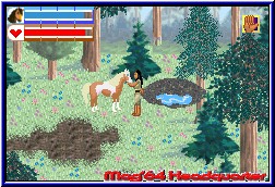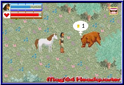 Mit Spirit: Der Wilde Mustang bringt THQ ein sicherlich nicht alltägliches Spiel auf den Markt, das nach dem durchspielen eine bestimmte Zielgruppe offenbart. Wer früher gerne Tamagotchi aller Arten gespielt hat und einen speziellen Hang zu Pferden aufweist sollte zumindest interessiert weiterlesen. Eigentlich in dieser Art neben Creatures das einzige Game auf dem GBA. Spirit: Der Wilde Mustang läßt euch in die Rolle eines Indianers oder seiner Gefährtin schlüpfen um danach Pferde zu zähmen und sie in das sogenannte Homeland zurück zu bringen. Das ist auch die Story des Spiels. Im sogenannten Homeland gab es es ein mächtiges Gewitter, das die Herde in alle Richtungen auseinander getrieben hat. Eure Aufgabe ist es nun in diesem Spiel alle Pferde nach und nach wieder zurück zu bringen. Das Spiel startet auch hier mit einer deutschen Sprachwahl und läßt euch im Hauptmenu ein Spiel starten oder ein angefangenes per Paßwort fortsetzen. Ein Wort zu den Paßwörtern. Ich lasse mir ja 6 Stellen gefallen bei einer Paßworteingabe. Aber 14 Zeichen, die sich auch noch in Groß und Kleinschreibung unterscheiden sind des guten zuviel und eigentlich antiquiert. Da hier damit viele Dinge mitgespeichert werden müssen wäre eine Batterie mehr als angebracht gewesen. Das Spiel beginnt damit das Ihr euch für einen der beiden angesprochenen Charaktere entscheiden müßt. Auf das Spiel selber hat dies wenig Auswirkungen. Die Locations und Aufgaben sind bei beiden gleich. Das Spiel bietet rund um das Homeland 6 verschiedene Locations, durch die Ihr die Pferde nach und nach zurückbrigen müßt. Startet das Spiel seid Ihr zu Fuß unterwegs in der aktuellen Location und macht euch in einer schrägen Iso Sicht auf das Geschehen auf den Weg irgendwo ein Pferd zu finden das herumsteht. Habt Ihr eines gefunden geht es zunächst darum es zu zähmen damit Ihr es reiten könnt. Oben links im Screen sind dazu die beiden wichtigsten Anzeigen. Oben das Vertrauen des Pferdes zu euch, sowie unten eine Lebensleiste des Pferdes. Beides müßt Ihr im Auge behalten und wenn möglich auf maximium pushen. Um ein Pferd zunächt einmal zu zähmen stehen euch viele Möglichkeiten zur Verfügung, die Ihr rechts oben per R-Taste als kleine Symbole seht und dort durchschalten könnt. Das beginnt bei Futter, das Ihr verstreut in den Locations findet. Viele verschiedene, die jeweils ein bestimmtes Pferd mag. Positiv das alle gefunden Dinge die man nicht gleich braucht auch Levelübergreifend behalten werden. Zu etwas müssen die Paßwörter ja gut sein. Desweiteren besitzt Ihr Fähigkeiten wie Sprechen, Singen und natürlich das Streichel Feature um die Pferde gefügig zu machen. Das Singen und Sprechen ist aber mehr ein Kauderwelsch und Soundkiller. Eigentlich ein Witz. Desweiteren natürlich Wasser.