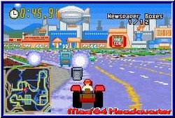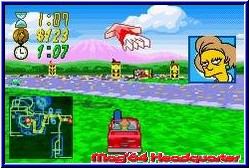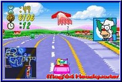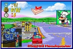 Lange hat es ja gedauert bis es die Simpsons in ihrem etwas anderen Rennspiel auf den GBA geschafft haben. Wenn man bedenkt das die GCN Version schon seit Mai 2002 auf dem Markt ist. Zumal ja meist die GBA Versionen früher da sind. Allerdings ist man ja in guter Gesellschaft. Hauptkonkurrent in diesem Spielgenre ist ja Crazy Taxi, den es ja nun auch erst viel später auf dem GBA gab. Die große Schwäche bei Crazy Taxi in der GBA Version war ja unbedingt alles an Umgebungen irgendwie auf den Screen zaubern zu wollen, was ja nicht unbedingt überzeugend klappte. Hier hat also die Road Rage Variante der Simpsons die Chancen dies wett zu machen und spielerisch über den Konkurrenten zu triumphieren. Zumindest läßt es sich hier durchaus gut an. Die GBA Version kommt komplett deutsch daher und bietet auch einen 2Player Modus über das Link Kabel an. Überhaupt findet man sehr viele Parallelen zur GCN Version. Was sich schon auf dem Hauptmenu deutlich zeigt. Sämtliche Spielmodi der "großen" Version findet man auch hier. Den Road Rage Modus, Gib Gas, den Sonntagsfahrer, Mission Modus und den angesprochenen Kopf an Kopf Modus für 2 Spieler. Dazu kommen hier noch die Optionen, die neben der Wahl des Schwierigkeitsgrades auch einen Punkt Extras beherbergen. Hier findet man bei bestimmten erfüllten Spielzielen nützliche Dinge wie auch Gimmicks. Ob nun alternative Hintergrundbilder für das Hauptmenu oder eben Streckenkarten für sämtliche Level. Weitere Parallelen findet man auch in den Modis selber. Inhaltlich erwarten den Simpson Fan die thematisch gleichen 6 Umgebungen, 16 möglichen Fahrer und 10 verschiedenen Missionen, was es von der Anzahl her auch auf dem GCN gab. Sind Charaktere und Fahrzeuge gleich ist der größte Unterschied natürlich die technische Umsetzung. Wählt man den Sonntagsfahrer Modus an darf man Just for Fun die Gegend und freigefahrenen Locations erkunden. Hier macht man auch seinen ersten Kontakt mit der Steuerung und der Umsetzung des Themas. Zunächst auffällig das man auch hier eine Pseudo 3D Engine verwendet hat, die aber im Gegensatz zu einem Crazy Taxi den genau anderen Ansatz verfolgt. Hier habt Ihr in der Mehrzahl flache Umgebungen und wenig Höhenunterschiede. Dabei kommt ein ähnliches System zum tragen wir in den GT Spielen. Eckige Kurven und ein sofortiges Anecken an der Straßenbegrenzung. Größter Nachteil dieser Engine ist aber die teilweise aufkommende Orientierungslosigkeit die man bekommen kann. Denn nicht immer erkennt man sofort welche Gasse man fahren und wo man plötzlich unsichtbar aneckt. Das ist halt schwierig wenn man nur auf pixelige Bodentexturen baut. Einige wenige Häuser überall und in den hinteren Leveln etwas Backgroundgrafik sorgen für einen gewissen räumlichen Effekt.
