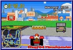 Die 10 gebotenen Missionen münden meist in Rennen bei denen nach Zeit Dinge eingesammelt oder umgefahren werden müssen. Hier ist man in meinen Augen zu schnell durch. Der Gib Gas Modus ist dann was für die Just for Fun Runde. Auch hier hat man nur bestimmte Zeitvorgaben, bekommt aber für alles Geld. Gerammte Fahrzeuge, das Umfahren aller möglichen Objekte wie Tonnen oder Straßenlampen und Boni für zu schnelles Fahren oder lange Sprünge. Positiv das verdientes Geld in einen Pool wandert. So macht man eigentlich nichts umsonst. Der Kopf an Kopf Modus erfordert 2 Spielmodule. Danach können 2 Fahrer in der gleichen Location nach Fahrgästen Ausschau halten. Wenn man so will Road Rage zu zweit. Für Cracks sicherlich ein spaßiger Modus ohne aber ein Killerfeature zu sein. Im Endeffekt glänzt das Spiel durch den Umfang, was ihn empfehlenswerter macht als Crazy Taxi. Die technische und damit grafische Präsentation könnte besser sein. Zuviel verpixelte Bodenumgebungen können dem Spiel auch ein wenig das Flair nehmen. Vor allem wenn man dauernd aneckt und denkt hier müßte es doch weitergehen. Das legt sich zwar bei längerem Spielen, muß aber in allen Locations aufs neue ausgelotet werden. Vielleicht ist der GBA für dieses Genre die falsche Plattform. Wer Rennspielaction will findet weit bessere Alternativen. Das Taxi Spielprinzip ist sicherlich interessant, scheitert aber noch an technischen Hindernissen.
