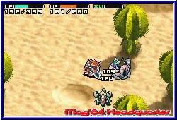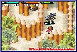 Nur das man Geld das man gefunden hat verloren hat. Wobei dies ebenfalls erst ab der Hälfte öfters der Fall ist, das man auch mal Geld findet. Dazu kommen Rohmaterialen die man finden kann und in der Stadt bei einem Schmied zu Waffen machen kann. Allerdings auch hier mit einem Haken. Selbst wenn Ihr die tollsten Rohmaterialen gefunden habt entscheidet das Geld das Ihr ausgebt was schlußendlich rauskommt. Je höher also eure Bereitschaft Geld zu geben ist, macht der Schmied bessere Dinge. Ebenfalls wieder vorhanden ist das Item Engels Feder. Ruft man diese mitten im Dungeon auf kann man sofort zur Stadt zurückreisen und die Shops besuchen. Der Teleport besteht solange bis man punktgenau in den Dungeon zurückkehrt. Ist z.b. die Itemleiste voll beamt man sich zurück, verkauft sein Zeug und geht wieder in den Dungeon. Gefahr für verdientes Geld gibt es nur beim Ableben, da dann sofort alles weg ist. Entschärft wird das ganze durch die Bank in Klantol. Dort kann der Spieler überflüssiges Geld und auch Waffen lagern und verliert sie so nicht. Die Kämpfe selber laufen immer nach dem gleichen Schema ab. Gegner tauchen auf, Ihr schwingt eure Äxte oder Schwerter und metzelt herum. Ihr bekommt die HP Zahlen der Treffer angezeigt und die Erfahrungspunkte die man so verdient. Was auch heißt es gibt wenig Abwechslung im Gameplay. Spielt man allein sind es immer die gleichen Abläufe. Keine Sidequests oder Rätsel die es zu lösen gilt. Die Endgegner der Dungeons sind zwar diesmal durchgängig gelungen, aber nicht die schwersten ihrer Zunft. So geht allein Flair verloren und bietet auf lange Sicht keine epischen Ausmaße. Wobei in Sachen Locations mehr im Spiel ist als die 8 Gebiete im ersten Teil. Einzig das Aufpowern des Charakters läßt einen immer weiterspielen. Hier punktet auch Shining Soul II wieder. Aber den Spielspaß eines Golden Sun oder der Breath of Fire Spiele erreicht das Game allein nicht. Wer aber einen Freund oder 3 zur Verfügung hat, die auch noch alle einen GBA und das Spiel besitzen können die höchsten Weihen erleben. Erneut Respekt Sega. Denn nun spielt Ihr jeder auf seinem Bildschirm mit seinem Charakter. Nun kann auch jeder einen anderen Charakter wählen und die RPG Party kann neben Kämpfern auch Zauberer beinhalten. Gefundene Waffen und Items werden viel mehr genutzt und verteilt und man kämpft taktischer, da nun auch die Entfernung z.b. eines Bogenschützen oder den Zauberern eine Rolle spielt. Immer im gleichen Bildschirm spielend kommt so wesentlich mehr Spaß auf. Da jeder seinen GBA samt Spiel nutzt kommt auch technisch nichts aus dem Tritt. Da hier Gegner auch noch schwerer zu besiegen sind macht aus dem Multiplayer eine anspruchsvolle Geschichte.