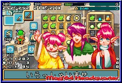 Für ein Rollenspiel immer ein wenig schade, da sich so der roten Faden in der Storyline nicht aufbaut. Schafft Ihr es nach Klantol bietet die Stadt immer das Zentrum des gesamten Spiels. Von hier aus startet Ihr zu euren Abenteuern, findet hier diverse Läden, Charaktere und könnt euch in der Heberge heilen. Das Spiel ist dabei so angelegt das Ihr die einzelnen Location zunächst nacheinander spielt. Irgendwo im Königreich passiert etwas und Ihr werdet vom König dorthin geschickt. Nach viel Kampfaction und einem Boss kehrt Ihr zurück und ein neuer Bereich auf der Weltkarte öffnet sich. Alle erledigten Bereiche können jederzeit neu besucht werden und man findet alles wieder vor, inklusive Gegner und Bosse. Neu ist das freischalten bestimmter Shops in geklärten Gebieten, die man aber erst finden muß. Grundlage des Spiels ist natürlich auch hier der Charakter, seine Stats und Ausrüstung. Hier hat Sega eigentlich nichts verändert bis auf die neuen Waffen und Gegenstände der 4 neu hinzugekommenen Charakter Klassen. Egal wo man sich befindet kann man mit der Starttaste das Pausenmenu aufrufen. Auf diesem in 4 Bereiche eingeteilt findet Ihr neben den Optionen das Speicher Menu, bei dem Ihr danach aber auf dem Hauptbildschirm des Spiels landet. Speichern und weiterspielen geht nicht. Auch gefällt mir in dem Zusammenhang nicht, das man zwar innerhalb eines Dungeons jederzeit speichern kann, aber beim Ausschalten des GBA später trotzdem erneut in der Stadt beginnt. Punktgenau klappt das also nicht. Die anderen beiden Bereiche stellen die wichtigen Charakter und RPG Bildschirme dar. Zum einen logischerweise die Stats des Charakters. Auf diesem Bildschirm bekommt man sämtliche Informationen zum eigenen Helden angezeigt. Levelstärke, Erfahrungspunkte, Geld und die verschiedenen Stats in Sachen Angriff, Verteidigung, Intelligenz oder der Vitalität. Alles was zu einem RPG dazugehört ist dabei. Desweiteren sind hier 2 Bildschirme zu finden, die es euch ermöglichen später im Spiel bei einem Level Up all diese Eigenschaften zu pushen, in dem man sogenannte Stat Points auf alle möglichen Eigenschaften verteilen kann und so selber beeinflußt was man gerne stärker haben möchte. Der zweiten Bildschirm des Charakters ist für das reine Gameplay wesentlich wichtiger. Hier findet man zunächst im Zentrum 25 Ablageplätze für Items, Waffen oder Geld das man im Verlauf der Dungeons findet. Dazu gibt es links den Bereich Ausrüstung und Waffen. Das Spiel ermöglicht es die Bereiche Kopf, Körper und Zubehör mit Items zu versorgen. Das heißt das gefundene Dinge angelegt werden können. Positiv das man am unteren Screenrand live sehen kann wie sich z.b. ein neuer Helm oder eine neue Waffe auswirken und ob sie Sinn machen.