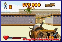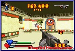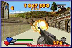 Serious Sam ist in der Videospielwelt keine unbekannte Spielfigur. Von anderen Plattformen bekannt verschlägt es den Zeitreisenden nun auch auf die Nintendo Systeme. Eher still in der Ankündigung und dem Release sollte neben dem GCN auch der GBA mal wieder bedacht werden. Dabei kommen Freunde der GBA First Person Shooter wieder auf ihre Kosten. Vor kurzem noch bei vielen Entwicklern die Abkehr von diesem Viewpoint festgestellt ist Serious Sam Advance nach Ice Nine gleich der nächste Shooter dieser Art auf dem GBA. Schnell abhaken kann man in diesem Zusammenhang das Thema GCN-GBA Link. Den gibt es nämlich nicht, obwohl es sich hier und da sicher angeboten hätte. Schade auch deshalb weil mit Entwickler Climax eine Firma für beide Spiele verantwortlich war. Die ersten Facts zum Spiel hören sich zunächst recht vielversprechend an. Neben einem komplett lokalisierten Spiel darf sich der FPS Fan auf einen 4Player Modus freuen, für den allerdings jeder Mitspieler eine komplette Ausstattung benötigt. Weniger schön ist mal wieder der hier enthaltene Paßwort Modus. Das die Batterie fehlt macht auch den enthaltenen Score Mode relativ unwichtig, da man Score Erfolge nicht dauerhaft sichern kann. Nach der Sprachwahl steht euch das Hauptmenu zur Verfügung das neben dem Einzelspieler Modus den Multiplayer bietet, sowie die Optionen für die Credits und den Soundpart als auch die angesprochenen Score Listen, die eher als Orientierung dienen. Beginnt Ihr den Einzelspieler Modus wählt man zunächst einen von 3 Schwierigkeitsgraden über die es noch ein paar Worte zu verlieren gilt. Dazu wird euch nun die Story anhand kleinerer Bildchen samt deutscher Texte nähergebracht. Mithilfe der Zeitreise-Technologie konnte der böse Mental das alte Ägypten und Rom in seine finstere Alptraumwelt reissen. Nur einer hat den Mut, zurück in die Zeit zu reisen und Mental und seinen Monsterhorden das Handwerk zu legen: Serious Sam. Dabei führt euch das Spiel in 2 Welten, das alte Ägypten und nach Rom. In jeweils 6 Level eingeteilt müßt euch hier nacheinander durch die Level kämpfen und bekommt danach jeweils das angesprochene Paßwort. Vor jedem Level gibt es ein kleines Briefing und Ihr könnt euch anhand einer Datenbank über Erfolge, Gegnerabschüsse und deren Eigenheiten informieren. Hier bleibt auch beim Paßwort alles an Einträgen enthalten. Startet ein Level beginnt Ihr immer mit 5 Leben und müßt am Ende ein finales Artefakt finden um das Level zu beenden. Bis dahin erwartet euch Shooter Action der bekannten Art. Aufgeteilt ist der Bildschirm in eure Waffe samt Anzeigen dafür, sowie 2 Leisten für die Lebensenergie und bei Aufnahme für die Rüstung. Die Steuerung zeigt sich teilweise von der etwas umständlichen Sorte.