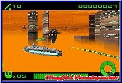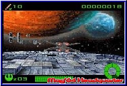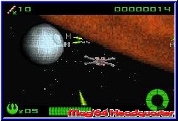 Entweder die Flugaction oder eben die Level mit dem Landgleiter und dem Speederbike. Bei beiden Varianten gleich sind Viewpoint, Steuerung und Anzeigen. So seht Ihr alles aus einer festen Sicht hinter dem Fluggerät. Verschiedene Viewpoints gibt es also nicht. Wichtigste Anzeigen im Screen findet man unterhalb. Rechts als Kreisanzeige die Lebensenergie und in der Mitte einen grünen Balken. Dieser Balken zeigt euch den Fortschritt im Level an. Gilt es z.b. im ersten Level Tie-Fighter ohne Ende zu erwischen, so nimmt der Balken mit jedem abgeschossenen Tie ab. Das gleiche bei den Gleitermissionen, wobei hier der Balken einen Countdown darstellt, vor dessen Ende Ihr den Endpunkt der Mission erreichen müßt. Ansonsten erscheint das manchmal überraschende Mission Fehlgeschlagen auf dem Screen. In Sachen Steuerung dürft Ihr euch nach allen Seiten bewegen, ohne das der Effekt des freien 3D erreicht wird. Ist aber ausreichend um das Spielprinzip gut rüber zu bringen. Das Grundtempo ist ohne euer zutun vorhanden und Ihr könnt nun je nach Vehicle per A-Taste die Primärwaffe abfeuern und per B-Taste wenn vorhanden die Sekundärwaffe. Dabei ist die Primärwaffe in Form der Laser unendlich nutzbar, während die Sekundärwaffe wie Raketen begenzt zur Verfügung stehen. Aufrüsten kann man diese wie auch die Energieanzeige durch Items die man beim Ableben mancher Gegner aufsammeln kann. In den Flugmissionen unterstützt euch ein Fadenkreuz um weit entfernte Gegner anzuvisieren und treffen zu können. Dabei ist gerade diese Action zwar grafisch wenig spektakulär, spielt sich aber ordentlich. Explosionen sehen nah am Falcon zwar recht pixelig aus, erzeugen aber den gewünschten Effekt in dieser Situation. Das typische freie Fiegen wie in Wing Commander ist hier nicht möglich, da die vor euch liegenden und auf euch zukommenden Objekte im übertragenen Sinne in festen Bahnen scrollen. So heißt es hier Ausweichen, Feuern und dabei Items einzusammeln und möglichst zu überleben. Dabei ist hier der Gamespeed gut und auch die Framerate ordentlich. Auch wenn Objekte an denen man nah vorbeifliegt recht pixelig wirken. Dafür bietet man auf Bespin und z.b. der Oberfläche des Todessterns gelungene Tapetengrafiken, welche die Grafik als ganzes aus dem schwarzen All Einerlei herausholen. Die Bodenmissionen mit dem Gleiter und dem Speederbike sehen grafisch dagegen richtig imposant aus. Zahlreiche Häuserschluchten, die nicht im Grafikaufbau vor euch auftauchen und Waldumgebungen die man als gelungen ansehen kann. Nur leider wird das zunichte gemacht durch ein nicht zu übersehendes Ruckeln. Eine bei weitem nicht konstante Framerate trübt hier den Spielspaß. Setzt man die Bremse oder den Boost ein geht das kurioserweise besser. |