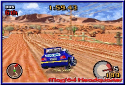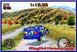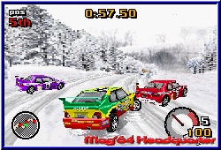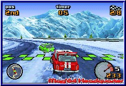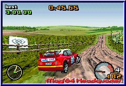 Zwar namentlich nicht lizenziert erkennt der Rally Fan aber durchaus welches Fabrikat er vor sich hat. Jeder Wagen bietet verschiedene Eigenschaften, die auch zu Beginn schon anzeigen, das noch wesentlich mehr Fahrzeuge im Spiel schlummern. Was auch dringend nötig ist um in den höheren Ligen was zu reißen. Danach startet die erste von 10 Prüfungen. Je 3 Rennen im Rally Stil von Punkt A nach B werden hier gefahren was allein in der einfachen Liga 30 Rennen bietet. Später im Verlauf des Spiels darf sich der Spieler über insgesamt 60! Streckenvarianten in diesem Modus freuen. Im Spritztour Modus kommen weitere dazu was die Streckenvielfalt auf 80 hebt. Thematisch bleibt man bei 10 Umgebungen, bekommt aber immer wieder neue Strecken vorgesetzt. Allein hier punktet das Spiel immens. Vor dem Start bekommt Ihr eine Übersicht über die anstehende Strecke in Sachen Bodenbelag und Wetter. Ihr dürft nun im enthaltenen Tuning Hand anlegen und von den Reifen über die Gangübersetzung bis zur Federung das Setup verändern. Wie sich zeigen sollte sind vor allem Gangübersetzung und Reifenwahl entscheidend und wirken sich im Rennen vor allem auch aus. Dazu kann man verschiedene Steuersetups wählen, was zur Folge hat das sich Wagen mal träger oder eben auch sehr direkt steuern läßt. Danach startet man sein Rennen und die Welt von Top Gear beginnt. Man muß nicht lange fahren um zu sagen das Tantalus eine technisch eine extrem gelungene 3D Engine auf dem GBA hinbekommen hat, die auch V-Rally vor allem in Sachen Weitsicht und Fahrbarkeit noch übertrifft. 2 verschiedene Viewpoints bietet euch das Spiel. Gefahren wird mit A und B für Gas und Bremse und gelenkt wird logischerweise mit dem Steuerkreuz. Unterstützt vom Tacho, einem Ausschnitt der Strecke und dem Beifahrer samt Pfeilen stürzt Ihr euch in das fahrerische Abenteuer. Hier zeigt sich ebenfalls ein sehr gelungenes Spiel. Die Steuerung kommt durch die großen Fahrzeuge und das anmierte Arbeiten der Wagen sehr zur Geltung und ist in meinen Augen noch einen Tick besser als in V-Rally. Weiches Einlenken, Driften, Gegensteuern und vor allem das sichtbare Einknicken des Wagens machen aus dem Spiel ein echtes Vergnügen. Entgegen einem V-Rally wo Ihr nur allein unterwegs seid fahrt Ihr hier immer gegen 7 Gegner. Nicht alle gleichzeitig am Start trifft man alle je nach Fahrweise nach und nach. Deren KI ist gelungen und fordert vor allem ab der mittleren Meisterschaft euer ganzes Können. Das die Fahrbarkeit ebenfalls einen Tick besser ist als bei V-Rally liegt auch daran das man links und rechts abseits der Strecken ebenfalls fahren kann und nicht sofort irgendwo aneckt. Man wird zwar langsamer und durch die entsprechenden Klänge darauf hingewiesen das dies nicht mehr die Straße ist, kann aber fahrerisch dadurch mehr machen. |
