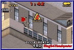| Hier nämlich könnt Ihr eurem Charakter 6 spezielle Moves zuweisen , die man vorher gekauft haben muß und die später im Spiel immens gut Punkte bringen. Dazu wird euch immer die entsprechende Tastenkombination angezeigt. Ihr merkt schon. In diesem Spiel steckt auch sehr viel Tiefgang. Auf dem Karriere Bildschirm wird euch ebenfalls das verdiente Geld angezeigt, sowie erfahrene Medaillen. Eine Geschichte die mir auf dem N64 seinerzeit sehr gefallen hat. Hier gelangt man nun zu den einzelnen Arenen. Wählt man diesen Punkt kann man zunächst nur ein Level anwählen. Auch hier ist die Geld- und Medaillenanzeige vorhanden. Desweiteren eine Prozentzahl wieviele der Aufträge Ihr schon erledigt habt. Auch etwas was großes Lob verdient. Selbst die N64 Version wird in den Schatten gestellt. Pro Level gibt es 10 Aufträge, die auf einer Liste gezeigt werden. Für alle gibt es einen bestimmten Geldbetrag. Sei es innerhalb des Levels einen bestimmten Highscore zu überbieten, bestimmte Gegenstände einzusammeln oder auch bestimmte Moves an bestimmten Locations auszuführen. Habt Ihr später eine Aufgabe gelöst wird diese durchgestrichen, so das Ihr genau seht was euch noch fehlt. Danach macht man wirklich den ersten Kontakt mit dem eigentlichen Spiel und reibt sich zunächst mal die Augen was da so abgeht. Grafisch ist Tony Hawk eine absolute Augenweide. Eine sehr klare Grafik, die euch in einer schräg von oben Sicht präsentiert wird. Vor allem mit welcher Detaillverliebtheit die Programmierer aber den Skater gemacht haben sucht auf dem GBA noch seinesgleichen. Mag man an der Grafik parallelen z.b. zu GTA finden so ist die Animation und grafische Präsentation des Skaters ein absoluter Hammer. Butterweich bei all seinen Bewegungen und Moves macht das ganze sofort Laune. Man muß es gesehen haben wie sich der Skater selbst in der Luft bei seinen Bewegungen geschmeidig bewegt und dabei die Moves sehr authentisch rüberbringt. Dazu kommen noch kleine Gimmicks wie spritzendes Blut wenn der gute auf den Kopf fällt. Doch all das wäre nichts ohne eine gute Steuerung. Und gerade hier beim wichtigsten in so einem Spiel wurde ganze Arbeit geleistet. Nach einer kleinen Eingewöhnungsphase läßt sich der Skater perfekt steuern. Hier gibt es eigentlich garnichts zu kritisieren. Er lenkt sich direkt und je nach Kreuzwinkel mehr oder weniger in die Kurve. Dazu kommt die sehr gute Tastenbelegung um die einzelnen Moves auszuführen. Ich habe irgendwann aufgehört zu zählen. Auch weil ich kein Skate Crack bin und mir manche Moves nichts sagten. Aber von der Fülle her mehr als ausreichend. Drückt man B springt der Charakter, wobei es wie bei TH oder 1080 so gemacht ist das man länger gedrückt hält um fahrt zu gewinnen und etwas höher zu springen. |