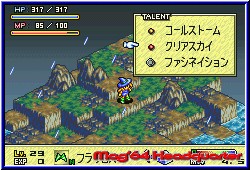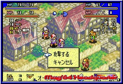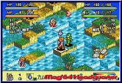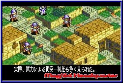 Einer der gößten Unterschiede zur N64 Version. Nicht in einer Pseudo 3D Karte wird sich bewegt und bei Kämpfen umgeschaltet, sondern alles in einem wird hier erledigt. Dabei sind die Locations immer feste Kampffelder von der Größe von 32x32 Vierecken. Das damit sehr große und grafisch ansprechende Locations machbar sind zeigt sich ebenfalls sehr schnell. Kleine Städe, Naturumgebungen von Gras, Wald, Schnee oder Wasser lassen hier schnell Freude aufkommen. Dazu ist auch grafisch sehr viel animiert. Die Umgebungen tragen so zu einer unverwechselbaren Atmosphäre bei. Ob es regnet, schneit oder selbst nächtliche Kämpfe für kurzweil sorgen. Alles ist ansprechend gestaltet. Dazu kommen teil extreme Höhenunterschiede, die aber auch einen spielerischen Effekt haben wie fast alles in diesem Sinne. Ziel in jedem Kampf ist es den gegnerischen Anführer einer Gruppe zu erledigen. Jeder Charakter besitzt natürlich eine HP Leiste, die im Kampf nicht sichtbar ist, aber jederzeit aufgerufen werden kann. Auch im Kampf selber habt Ihr vollen Zugriff auf die Menus. Hat man alle Charaktere platziert klickt man einen an und bekommt jetzt je nach Klasse, Ausstattung und Entwicklung die Laufwege farblich unterlegt. Das können nur ein paar Felder sein, geht aber auch über weite Entfernungen. Hat man den Endpunkt markiert läuft der Charakter dorthin und man bekommt das Action Menu zu sehen. Jetzt kann man entweder in einer der 4 Richtungen schauen oder auch Gegner angreifen so einer in der Nähe ist. Kämpfer mit Nahkampf Waffen müssen dabei genau neben dem Gegner stehen, während Zauberer auch weiter entfernt stehen können. Klickt man beim Zauberer am Ende des Laufzuges das Kampfmenu an kann man unter den möglichen Sprüchen wählen und bekommt anschließend wieder farblich unterlegt die Felder auf man den Spruch anwenden kann. Es muß nicht immer auf den Gegner gehen. Das kann auch ein Healer Spell auf einen eigenen Charakter sein. An Zauber Sprüchen gibt es ebenfalls verschiedene Klassen. 6 gibt es die sich z.b. in Feuer, Eis, Erd oder Dunkelheits Sprüche einteilen und teils verheerende Wirkung haben. Steht man nun mit seinem letzten Zug neben einem Gegner sollte man versuchen ihn entweder seitlich oder von hinten zu erwischen. Dieses System ist perfekt hinbekommen worden und auch nachvollziehbar. Ein Schwertangriff von einer erhöhten Stelle hinter einem Gegner bringt wesentlich mehr Erfolg als ein frontaler Angriff. Dabei kann sogar ein schwacher Charakter einen starken Gegner gut zusetzen. Gekämpft wird Rundenbasiert. Das heißt Ihr habt bei einem eigenem Zug den ersten Angriff. Habt Ihr geschlagen macht der Gegner entweder einen Konter (Guard) oder muß einen Treffer einstecken. Dann erscheint die abgezogene Anzahl an HP Punkte über dem Kopf.
