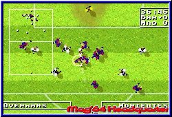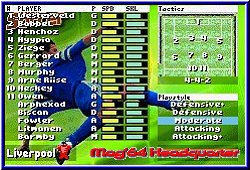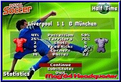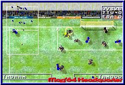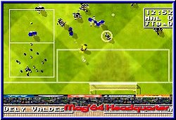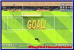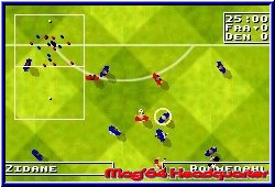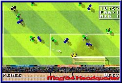 Das kann vom satten grün über Matsch auch gefrorener Boden sein, was später auch grafisch ansprechend rübergebracht wird. Danach gelangt man zum Mannschafts und Taktikscreen. Hier kann zwischen den 16 verfügbaren Spielern auch wechseln und seine Aufstellung vornehmen. Neben allen erdenklichen taktischen Aufstellungen darf der Spieler ebenfalls den Stil seines Spiels von Defensiv bis zur berühmten kontrollierten Offensive einstellen. Ist man hier mit allem fertig geht es auf den Platz und die Spielgrafik präsentiert sich. Hier kommt der Punkt der sicher die Geschmäcker teilen wird. Nicht wie sonst in einer schrägen Iso Perspektive sieht man das Geschehen, sondern direkt von oben. Man sieht also praktisch nur die Schultern und den Kopf der Spieler. Das Dribbling ist nur bei genauem Hinsehen zu erkennen. Was aber in diesem Fall nicht schlimm ist. Nach einem stimmigen Einlauf, wobei mir die Zuschauerkulisse sehr gut gefällt geht es zum Anstoßkreis. Nach dem Anpriff ist es nun natürlich das Ziel durch Tore schießen zum Erfolg zu kommen. Zunächst unterstützen euch die verschiedenen Anzeigen auf dem Screen. Über eine recht übersichtliche transparente Feldanzeige werden alle Spieler als farbige Punkte angezeigt, sowie sämtliche Namen der Ballführenden Spieler unten links und rechts im Screen. Oben rechts sind die Zeitanzeige und der aktuelle Spielstand zu finden. Gesteuert werden eure Recken natürlich mit dem Kreuz, wobei das laufen, passen und schießen damit beeinflußt wird. Die Steuerung an sich ist gelungen. Je nachdem ob Ihr im Angriff oder der Abwehr seid stellt diese sich um. Im Angriff wird per B-Knopf gepaßt, wobei die Richtung des Kreuzes die Paßrichtung beeinflußt. Mit dem A-Knopf wird geschossen. Hier haben die Entwickler eine Schwäche vorangegangener Spiele mit dieser Sichtweise ausgemerzt. Laßt Ihr den Schußknopf sofort los wird es ein Flachschuß. Je länge man ihn gedrückt hält um so höher geht der Ball. Diagonale Pässe auf die Flügel oder Konterangriffe lassen sich wunderbar bewerkstelligen. Auch hier paßt sich die gute Feldanzeige sehr gut an, da man genau weiß wo die Spieler sind. Auch wenn ich Anfangs mehr über das einfach Paßspiel mein Glück versuchte, was ja nicht schlecht ist, merkt man mit der Zeit wie gut die Flanken klappen. Das hat auch den Grund das man den Ball im Flug per Kreuz schlenzen kann. Ob beim Torschuß oder bei der Flanke. Nach ein wenig Übung klappt dies reibungslos. Hier ist auch technisch nichts zu meckern. So sind auch Kopfbälle bei diesem Viewpoint machbar. Seid Ihr in der Abwehr könnt Ihr entweder ein Tackling versuchen oder aber auch durch Einsatz eines Fouls den finalen Schuß verhindern. Dabei sind die Schiedsrichter aber recht human. |