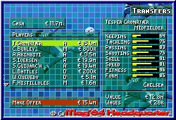 Man sollte sein Team so aufstellen, wie es das Leistungsvermögen der Spieler hergibt. Und bei einer 5-3-2 Aufstellung die totale Offensive auszurufen, ist Unsinn, da bei dem mageren Mittelfeld kaum Spieler als Anspielstation nachrücken. Der Blick aufs Spielfeld erfolgt von oben, in einer totalen Draufsicht. Links bietet uns die Radarübersicht den Überblick auf das Feld, wo sich zur Zeit unsere Spieler aufhalten. Und unten sehen wir die Namen der zur zeit aktivierten Spieler. Das Kuriose beim Total Manager ist, das Vereinsnamen und Spielernamen korrekt sind. Nur das die Spieler falsche Vornamen haben und bei zum Teil anderen Vereinen und auf anderen Positionen spielen. So spielt zum Bsp. Derek Sörensen spielt normalerweise beim BVB im Sturm. Hier allerdings heißt er Dirk und ist Verteidiger beim SC Freiburg. „Robert“ Effenberg ist Stürmer, Marcelinho ist Verteidiger in Köln u.s.w. Am Anfang hat man damit etwas Probleme, aber man gewöhnt sich ja an alles. Beide Manager Modis bieten die selben Funktionen, nur das man eben als Spieler/Manager selbst raus muß auf den Rasen. Doch die taktischen und wirschaftlichen Belange des Vereins stehen hier im Vordergrund. Wenn man neu beginnt, ist die Truppe in einem mäßigen Zustand. Hier nun ist euer Gespür gefragt, ob es ein schlechter Spieler schafft den Anschluß an den Rest der Mannschaft zu finden, oder ob man sich gleich nach passenden Ersatz umsieht. Das Manager Menu bietet euch die Möglichkeit zum Trainieren, Transfermarkt, Tacktikmenu, Finanzübersicht, Statistiken einsehen u.s.w. Rechts wird uns das aktuelle Vereinsvermögen, Tabellenplatzierung und Pokalrunde angezeigt. Unten sehen wir den Saisonspielplan mit den nächsten drei Spielen. Nun müssen wir erst einmal eine schlagkräftige Truppe formieren, Zuschauer ins Stadion locken und Kohle machen, damit man sich gezielt verstärken kann. Wenn es zu Beginn nicht so läuft, wird der Vorstand etwas „maulig“ und bemängelt, das man sich mehr erwartet hatte. Doch selbst bei einem Abstieg in die zweite Liga, wird man euch nicht feuern. Nach drei Spielzeiten hat man dann soviel Kohle zusammen, das sich Topspieler verpflichten lassen, das Stadion ausgebaut werden kann u.s.w. Das große Ziel ist, im internationalen Geschäft ordentlich mitmischen zu können. Doch der Weg dahin ist weit und steinig. Wer sich nicht allein auf diesen Weg machen möchte, der kann zusammen mit einem Partner im Linkmodus spielen oder sich auch nur zu einem Arcade Match treffen. Hier wird dann gegeneinander ausgespielt, wer Herr im Ring ist. Um Spaß im Arcade Modus oder Spieler/Manager zu haben, der muß für diese „Ansichtssache“ von oben zu spielen viel übrig haben. Es ist nicht jedermans Sache aus der Totalen Perspektive Freude am Spiel zu empfinden. Wenn man sich nur mit dem Manager Part auseinandersetzt, hat man eine ganze Weile Spaß, bis man soviel Geld zusammen hat, um sich alles und jederman kaufen zu können. Dann hört auch hier der Spaß auf. Ich bin sicherlich ein richtiger Manager Liebhaber, aber auch bei mir stellte sich im vierten Jahr Langeweile ein. Das sollte nicht sein. Auch wenn das Spiel eine ganze Menge bietet, hat es mir keine schlaflosen Nächte bereitet, wie es ein Topspiel machen sollte. Ich würde sagen, mit viel Glück schafft es einen UEFA Cup Platz oder UI Cup Teilnahme, auf keinen Fall die Champions League Teilnahme in der Spiele Liga. |