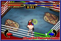 Im Kampfbildschirm sehen wir ganz oben die Aktivitätsleiste, die für das bewerten der Runde ausschlaggebend ist. Wer mehrere Treffer landet, zieht nicht nur seinem Gegner die „Energie“ aus seiner Leiste, sondern wird auch mit einer Tendenz in der Aktivitätsleiste belohnt. Um die Tendenz zu verdeutlichen, sehen wir links und rechts neben der Leiste ein Kästchen mit Zahlen, die bei schlechtem Kampf niedriger werden. Unten sehen wir jeweils links und rechts einen Handschuh, der sich etwas füllt, wenn man einem gegnerischem Schlag erfolgreich ausgewichen ist. ist der Handschuh vollständig gefüllt, blinkt er und signalisiert uns, das man einen Superschlag ausführen kann. Daran sieht man, das es nicht das beste ist, seinen Gegner permanent zu attakieren. Immer wieder seinen Schlägen ausweichen, einen Konter fahren oder selbst überlegt eine Salve abzuschießen. Besonders wichtig ist es, den Kraftvollen Schlägen auszuweichen, die sich dadurch bemerkbar machen, das die jeweilige Faust blinkt und auch als Geräusch wahrnehmbar ist. Versucht der Gegner einen kraftvollen Schlag mit der Linken, pendeln wir nach links, damit der Schlag uns verfehlt. Dabei lassen sich die besten Konter setzen. Wichtig ist, das wir uns daran gewöhnen, die L und R Tasten mit einzusetzen. Zum ersten lassen sie uns pendeln und zum anderen bewirken sie die verschiedenen Schlagvarianten. Doch das haben wir ja alles schon im Training gelernt. ist der Kampf zu Ende, holen wir uns das Lob von Iron Mike oder die tröstenden Worte nach einer Niederlage. So erklimmen wir nach und nach den Ring der besten und machen uns einen Namen. Wer liest nicht gern in der Zeitung, das man seinen Gegner „zerstört“ habe. Da man in allen drei Gewichtsklassen den Gürtel holen will, dauert es schon eine Weile, bis man dieses Ziel erreicht hat und außerdem noch die Horde versteckter Boxer freigespielt hat.