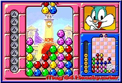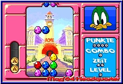 In den letzten Wochen ist es ein wenig ruhig um den GBA geworden. Kein Wunder, in Zeiten des GCN Release schauen die Käufer weniger auf Nintendo's Kleinen. Aber das ändert sich in nächster Zeit wieder. Ebenso ruhig ist es lange um den Knobel und Puzzle Bereich auf dem GBA geworden. Zwar steht mit Mr. Driller 2 für mich zumindest das Game dafür vor der Tür, dennoch gibt es mittlerweile eine weitere Alternative - Whacky Stackers. Dieses Spiel das wieder einmal die Tiny Toons als spielerischen Background bietet soll den Käufer ebenfalls wieder dazu bringen seine Kombinationsgabe zu benutzen. Wollen schauen wie Warthog das gelungen ist. Zunächst lobenswert das trotz wenig Text im Spiel auch deutsch in der Sprachwahl steht. Danach geht es schnurstracks zum Hauptmenu das euch die Punkte Überleben, Puzzle, Computer und den Mehrspieler anbietet. Besonderes Lob an diesen, der zwar nur MultiPak fähig ist, dafür aber bis zu 4 Knobel Freunde um die GBA's versammeln kann. Der Punkt Überleben ist vergleichbar mit dem Marathon Modus eines Tetris, wobei das Spielprinzip ebenfalls an den Klassiker angelehnt ist. Allerdings mit einigen neuen Feature. Ihr stellt vor dem Spielen ein welchen der 3 Schwierigkeitsgrade Ihr als passend empfindet, wobei sich alle 3 anfänglich wenig unterscheiden, sondern erst im Verlauf einer Session die Unterschiede offenbaren. Der Spielscreen zeigt sich aufgeräumt. Zunächst auch hier das große Spielfenster für die spielerische Action, sowie links eine Reihe für sogenannten ACME Münzen und rechts die Anzeigen für Zeit, Score und das aktuelle Level das Ihr erspielt habt. Rechts oben der sogenannte Paßbild Bereich definiert Helfer im Spiel, die mit den ACME Münzen zusammenhängen. Doch der Reihe nach. In Whacky Stackers sind die Spielobjekte kleine verschiedenfarbige Eier, die von oben nach unten fallen. Dabei sind immer 2 miteinander verbunden und können die gleiche als auch verschiedene Farben besitzen. Fallen diese nach unten könnt Ihr sie vertikal wie auch horizontal nach beiden Richtungen mit A und B drehen. Ihr könnt beide Eier also nebeneinander oder übereinander ablegen. Fallen sie dabei auf eine Art Treppe schon gefallener Eier passen sich die neuen dem an und werden ebenfalls so abgelegt. Sind als nicht starr verbunden wenn man sie horizontal ablegt. Ziel muß es nun sein 4 gleichfarbige zusammenzubringen. Dabei ist es egal welche Form das hat. Hauptsache sie berühren sich. Einziger Unterschied ist nun der das Ihr sogenannte Rieseneier fabrizieren könnt. Schafft Ihr es also 2 gleichfarbige Paare direkt übereinander zu legen verschmelzen sie zu einem Großen Ei. Das bleibt zunächst liegen und wird erst bei einer angrenzenden Kombo mit verschwinden. Effekt ist zunächst ein höherer Score, sowie eine ACME Münze.