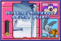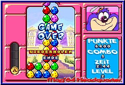 Habt Ihr eine der Münzen im linken Feld erscheint im Paßbildbereich einer der Tiny Toons, die euch helfen. 8 verschiedene gibt es, die sich immer in ihren Fahigkeiten überbieten. Habt Ihr z.b. 1 Münze könnt Ihr mit der L-Taste jederzeit Dizzy Devil rufen, der die unteren beiden Reihen leert. Wartet Ihr aber z.b. bis Ihr 5 Münzen habt, denn sammeln ist möglich, erscheint nun z.b. Gogo,der sämtliche mittlere Reihen neutralisiert. Hier heißt es abwägen, bringt aber Spaß in die Sache. Denn das anordnen der Eier macht nicht minder Spaß als in anderen Spielen des gleichen Genres. Hektisch wird's bei den höheren Leveln, was immer automatisch ab bestimmten Scoregrenzen passiert. Dann ändert sich die Schnelligkeit der Eier und die Farbwahl ist selten gleich. Da man keine Vorschau hat was als nächstes fällt, sollte man die Geschwindigkeit nicht unterschätzen. Glücklich wer hier seine Helfer aufgespart hat. Leider bietet auch Whacky Stackers keinerlei Batterie, was ich immer wieder schade finde. Zwar OK immer nach neuen Highscores zu streben, aber macht man den GBA aus ist auch der Score weg. Der Puzzle Modus bedient sich des gleichen Spielprinzips, allerdings mit dem Unterschied das Ihr nun wahlweise gegen 3,5 oder 8 der Tiny Toons antretet. Dabei müßt Ihr schon fertige Spielscreens lösen, das heißt ein voller Spielscreen braucht nur noch 2 Eier um gelöst und komplett geleert zu sein, was eure Aufgabe und das Spielziel in jedem der Level hier ist. Jeder Tiny Toon bietet euch 5 Level, ehe Ihr zum nächsten kommt. Am Ende könnt Ihr so den geheimen Toon Sweetie freispielen. Dabei stehen euch 5 4 Continues zur Verfügung solltet Ihr einmal ein Level nicht lösen. Aber auch hier durch die fehlende Batterie nur bedingt motivierend. Der Computer Modus ist nichts anderes als gegen einen CPU Gegner zu spielen, dessen Spielfeld nun klein unten links dargestellt wird. Hier sind die ACME Münzen noch wichtiger, da die Helfer auch den Gegner attackieren können und euch so den entscheidenden Vorteil bieten können. Im Mehrspieler Modus kommen nun die schon angesprochenen 4 möglichen menschlichen Spieler zum Zuge. Wer die Möglichkeit hat findet hier eine Variante die auch ohne speichern lange Spaß machen kann, da hier die Herausforderungen immer wieder neu sind. Grafisch ein schönes Spiel, das den GBA aber nicht ausreizt. Kleinere Animationen und ein Comic Stil, der dem Trickfilm Original entspricht. Der Sound ist recht unauffällig. Er dudelt vor sich hin, ohne zu nerven. Paßt zum teilweise hektischen Spielprinzip. Auf jeden Fall eine weitere gute Tetris Variante, die man mit Columns Crowns vergleichen kann. Den Umfang eines Bust A Move Advance oder Mr.Driller 2 erreicht er aber nicht. Wer also Level bis zum Abwinken spielen will ist dort besser bedient. Wer aber nach einer guten Puzzle Alternative sucht wird hier fündig. |