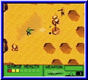 Der Menupunkt Spiel öffnet das Tor zur Action. Von den beiden Missionsumgebungen ist nur eine anwählbar. Man muß sich also erst einmal durch die Wüste schlagen und die braunen vertreiben, bevor man sich ihnen in den Bergen annehmen kann. Jede Missionsumgebung ist in drei Sektionen aufgeteilt. In jeder Sektion müßt ihr und Sarge vier bis fünf Aufträge ausführen, bevor die nächste Sektion anwählbar ist. Vor Spielbeginn erhaltet ihr schriftlich den Auftrag, den es auszuführen gilt. Dann seid ihr auch schon mitten im Geschehen. Der kleine grüne Kerl, den ihr schräg von oben seht ist Sarge, der sein Geschick und sein Plastikleben in eure Hände gelegt hat. Am unteren Bildschirmrand sieht man die Gesundheits- und Inventarleiste. Die Gesundheitsanzeige neigt sich bei permanenten Beschuß von Grün über eine kurze Gelb- phase bis zum letzen roten Kästchen, das das bekannte letzte Loch zum pfeifen darstellt. Damit man nicht schon kurz nach Anpfiff den Plastiklöffel reicht, findet man unterwegs zwei verschiedene Arten von Healthpäckchen. Die einen stellen den Gesundheitszustand sofort wieder her und die anderen sind transportabel, entsprechen aber nur der Wirkung eines Aspirins. Doch sie haben halt den Vorteil, das man sie in der Inventarliste verstauen und bei Bedarf einwerfen kann. Nachteil ist der akute Platzmangel bei Sarge. Er kann neben seinem Sturmgewehr (Standart) nur noch zwei Dinge tragen. Da man aber in den Leveln viele schöne Zerstörungsmaschinen findet, muß man abwägen was man bei sich mitführt. Abhilfe schafft da nur das Ablegen von Gegenständen, die ihren Zweck schon erfüllt haben. Hat man zum Bsp. den verminten Bereich verlassen, braucht man das Minensuchgerät nicht mehr und nimmt stattdessen eine Bazooka an sich. Ein guter Tausch:-) !!!