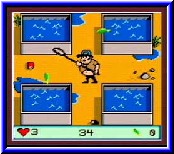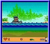 Also schicken wir unseren Billy Boy zuerst zum angeln. Beim Eintreten in die Fischbude erklärt uns Jake, welchen Fisch die gute Daisy am liebsten von uns haben möchte. Danach gilt es die begehrte Lizenz zu erwerben. Dafür müssen wir rollende Sodabüchsen vom Steg fischen. Wir bewegen das kleine dicke Kerlchen von links nach rechts auf dem Steg und sehen unten die verbleibende Zeit und einen Balken der die Lizenz bedeutet. Je mehr Büchsen wir fangen, desto grüner wird der Balken. Ist von dem Rot nichts mehr zu sehen, haben wir die Lizenz in der Tasche. Danach brauchen wir natürlich auch noch Köder zum Angeln. Selbstredend das wir die nicht im 10 Pack kaufen können, sondern selbst fangen müssen. Drei verschiedene Köderarten gibt es zum fischen. Würmer, Krebse und Erlritzen. Von jeder Sorte kann man maximal 10 Stück fangen und mitnehmen. Durch die Hintertür kommt man zum Bootssteg wo drei Boote vertäut liegen. Diese drei unterscheiden sich nicht nur rein äußerlich, sondern auch durch ihre Schnelligkeit und damit verbundene Sinkgeschwindigkeit. Hat man keine Lizenz erhalten sollte man sich das schnelle Boot greifen um eventuell dem Ranger entkommen zu können. Allerdings ist die Sinkgeschwindigkeit um ein vielfaches höher als bei der Nußschale und dem Indianerkanu. Dann paddelt man auf den See hinaus und versucht sein Glück, drei der verlangten Fische zu angeln. Rechts hat man immer den Füllgehalt des Bootes im Auge. Man sucht sich auf dem Teich eine erfolgversprechende Stelle und drückt die Starttaste. Im Pausenmenu kann man die Fischtiefe einstellen, den Köder wechseln oder weiterrudern. Hat man die optimale Fischtiefe und den besten Köder eingestellt wirft man die Angel aus. Hat etwas gebissen macht es sich akustisch bemerkbar und in der unteren Bildschirmleiste steht ein Fischsymbol. Man kann verschiedene Sachen ins Boot holen. Stiefel und Büchsen helfen den Wasserstand im Boot zu mildern. Doch am ärgerlichsten sind die anderen Fische, die die kostbaren Köder wegfressen, aber keinerlei Nutzen bringen. Hat man noch nicht die erforderliche Menge gefangen, der Wasserstand aber die Oberkante des Bootes erreicht hat, oder die Köder alle sind hat sich das Abernteuer Angeln erledigt. Die gute Daisy hat dann nur noch einen dummen Spruch auf Lager und Tschüß Billy Bob. Doch hat Neptun euch ins Herz geschlossen und ihr drei verlangte Fische gefangen gehts zurück zum Startpunkt. Daisy ist dann sehr erfreut von euerm Glück und gratuliert. Nun sollte man das "stille Örtchen" aufsuchen und sich das Passwort notieren. Nun auf zur Jagdhütte und das Wildbred geschossen. Auch hier muß man sich erst die Lizenz erschießen.