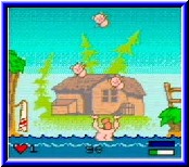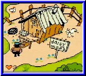 Der Menubildschirm weicht schon von dem bisher bekanntem ab. So ist das Menu in einer Wegkreuzung verankert. Den Weg nach rechts oben sollte man sich schon mal merken, denn da wohnt unsere "Zarte". Unten rechts geht es zur Jagd- und unten links zur Fischhütte. Das Passwortmenu oben links befindet sich, sinniger Weise, auf dem stillen Örtchen. Auf jedem Bildschirm unten links sehen wir ein Herzsymbol mit einer Zahl daneben. Das ist der aktuelle Liebeszustand von Daisy zu unserem Helden. Baut Billy Mist, zum Bsp. erlegt er das falsche Tier oder ist ohne Lizenz unterwegs und wird erwischt, geht ein Herz verloren. Man beginnt mit einem "Guthaben" von drei Herzen, was auch der Höchstzahl entspricht. Ist kein Herz mehr da, ist die "Schnecke" zum Teufel und unser Billy bleibt ein ewiger Junggeselle.