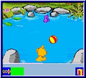 Durch das drücken der A Taste wird das Spiel gestartet. Nun erhält man von seinem Spielgefährten die Inhalt des Spiels und legt dann los. Um mit dem großen Bären Guck - Guck zu spielen, müssen wir uns unbemerkt an ihm vorbeischleichen und schnell die Geschenke auspacken. Bei jedem Spiel seht ihr unten einen grünen Balken, der sich langsam von links nach rechts bewegt, sobald wir ein Teil der Aufgabe gelöst haben. Genauso verhält es sich beim Popcorn fangen, Seifenblasen Spiel, Memory, Federn fangen, im Irrgarten, Wasserball und dem Sterne fangen. Sollte euch ein Fehler unterlaufen, das ihr zum Bsp. rotes Popcorn fangt, oder eine Feder fallen laßt, dann nimmt der grüne Balken ab und wenn er ganz verschwunden ist, dann muß man von vorn beginnen.
