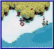 Mit der Start Taste kann man dagegen noch einmal duchatmen, sich ein Bild von der jeweiligen Situation verschaffen indem man sich die Daten des Gefechtes ansieht. Was hat man noch an Truppenkontingent und vieviele Gegner hat man schon getötet. Auch das Briefing kann man noch einmal studieren, das Game beenden oder das Level noch einmal neu starten. Doch hingegen meiner Erwartungen, beginnen wir nicht mit der Sollstärke der Truppe, sondern mit dem Rest des abgebrochenen Spiels. Doch die Gegner sind wieder vollzählig. Im unteren Abschnitt des Pausenmenus haben wir unser Radar. Dort werden alle Gegner als kleine weiße Punkte dargestellt. So behält man auch am besten die Übersicht über die Situation und das Auftragsende. Denn bevor nicht alle Gegner von der Karte verschwunden sind, dürfen wir nicht nach Hause. Und Gegner sind auf dem Schlachtfeld in unterschiedlichen Formationen unterwegs. Da gibt es die normalen Scouts, die Berserker mit dem Gewehr. Diese gattung ist noch als normal zu bezeichnen. Doch die Grenadiere, Bazookaschützen und Mörserteams gehen einem ganz schön auf den Zeiger. Von Scharfschützen und Maschingewehrschützen rede ich gar nicht. Dies sind die Garanten dafür, das ihr nicht alle Jungs nach Hause bringt und keiner den Rang eines Generals erreichen wird. Ferner gibt es noch andere Gegner, wie Eingeborene oder Elitetruppenführer, die euch zu schaffen machen werden. Es müssen aber nicht immer menschliche Gegner sein, die eure Jungs dahin raffen. Wer nicht aufpaßt kann schnell auf eine Mine treten, einen Stolperdraht mit Bombenexplosion auslösen oder in eine schlichte aber tödliche Lanzenfalle tappen. Der Tod lauert überall in diesen Gebieten. Diese Gebiete können sich in 40 fache Bildschirmgröße erstrecken. Wer da nicht auf seine Jungs Obacht gibt, für den ist das Spiel ganz schnell Game Over. Leider darf man erst nach jeder bestandenen Mission speichern. Sprich man muß bis zu vier Aufträge mit seinen Leuten überstehen, bevor es ans erlösende Speichern geht. Zwar bekommt man nach jedem Auftrag neue Rekruten aber ob die es bringen werden?