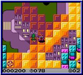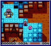 Schaltet man den GBC ein darf man aus 6 Sprachen wählen, was mittlerweile auch nicht mehr jede Firma macht. Auf dem Hauptmenu stehen euch die Punkte Start, Paßwort und Options zur Verfügungen, wobei in den Options nur Soundtechnische Dinge einzustellen sind. Beginnt man ein Spiel liegen 5 Welten a 5 Level vor dem Spieler. Dabei muß man das Spiel auf Leicht beginnen und durchspielen um danach erst zum Schweren Modus zu gelangen. Schon das sollte für Stundenlange Beschäftigung reichen. Beginnt man ein Level wird euch zu jedem einzelnen Level die Besonderheit in einigen Sätzen dargelegt. Hier ist das Spiel auch sehr verständlich und man geht gut gewappnet in das Game. Aufgebaut sind alle Level in begehbare Felder die in einer von oben Sicht gezeigt werden. Grob gesagt steht Stubby innerhalb des Levels herum und Dizzy wird von euch laufend zu den Süßigkeiten gesteuert um diese dann den Weg zurück zu Stubby zu bringen. Soweit so gut. Das man trotzdem zeitweise den GBC in die Ecke schmeißen möchte liegt an dem ganzen drumherum. ;-) Wie schon erwähnt könnt Ihr nur auf bestimmten Feldern laufen. Tritt man daneben verliert man ein Leben,wobei mit 4 Leben begonnen wird. Dazu sieht man im Screen eine Leiste die Dizzy’s Wirbelattacke bei Gegnerkontakt beschreibt, sowie Hilfsmittel wie einen Bücherwurm möglich macht. Dazu eine wichtige Zeitanzeige, die ebenfalls den Schwierigkeitsgrad nach oben hebt. Denn um alle Süßigkeiten einzusammeln steht euch nur ein bestimmtes Zeitlimit zur Verfügung, das teilweise mehr als knapp bemessen ist. Ihr steuert Dizzy mit dem Steuerkreuz in alle Richtungen. Dabei reicht es dann die Süßigkeit eizusammeln in dem man drüber läuft. Bis dahin liegen vor euch Barrieren, Falltüren vor denen man abwarten sollte, komplette Bereiche die nur in Förderbänder eingeteilt sind, wo man genau studieren sollte wo sie einen denn nun hinbringen. Denn nicht selten vertut man sich bei mehreren und landet im Abgrund. Das dumme ist das man dann immer sofort bei Stubby erneut anfängt. Hat man eine Süßigkeit erreicht ist man noch lange nicht fertig. Erst muß man damit den ganzen Weg wieder zurück. Verliert man auch hier ein Leben oder hat Gegnerkontakt muß man diese Süßigkeit erneut holen. Das kann nerven und ist einer der Kritikpunkte.