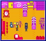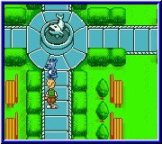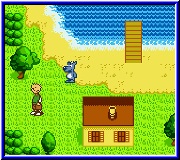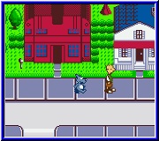 Zunächst jedoch positiv das dieses Spiel komplett in deutsch gehalten. Denn was die Zielgruppe angeht sollte selbst englisch hier nicht vorkommen. Über das Hauptmenu kann man das Spiel starten, in den Options den Sound aktivieren oder per Paßwort einen erreichten Spielstand laden. Wird das Spiel gestartet wird euch in einem per Standbilder gemachten Vorspann erneut die Story nähergebracht. Danach beginnt das Spiel in Doug’s Heimatstadt Bluffington und der Spielmodus 1 beginnt. In diesem Teil spielt sich Doug wie ein gewöhnliches Adventure. Ihr schaut schräg von oben auf das Geschehen und durchquert die einzelnen Gebiete von Bluffington. Gut gelöst ist dieses Feature. 5 verschiedene Orte gibt es die man per Start über eine Karte anwählen kann und somit jederzeit die Location wechseln kann. Was man auch muß. Denn bis Doug seine Freundin findet gilt es viele kleine Aufgaben zu lösen. So trifft Doug Freunde und Bekannte die alle irgendein Problem haben. So muß er Leute finden oder bestimmte Items von einem Charakter zum anderen bringen. Unterstützt wird Doug dabei durch einzelne Telefonzellen. Um sie zu benutzen findet er verstreut in allen Gebieten Vierteldollarstücke. Nutzt er eine der Zellen bekommt Doug weitere Hinweise auf seiner Suche nach Patti. Gesteuert wird Doug wie gewohnt über das Kreuz. Wollt Ihr mit jemanden reden drückt man B und erhält einen Auftrag oder auch nur belangloses Gelabere. Jeder Charakter ist zwar wichtig. Aber erst nach und nach spielen diese ein Rolle. Hat Doug eine Teilaufgabe gelöst geht es in den zweiten Teil das Spiel. Den Action Modus in dem seine angesprochenen Superman Fähigkeiten , die hier Quailman heißen wichtig sind. Jetzt wechselt die Ansicht auf eine reine 2D Scroll Ansicht. In diesem Modus gilt es immer kleinere Zwischengegner zu besiegen. So z.b. einen riesigen Roboter durch gezielte Schüsse auf bestimmte Körperteile zu eliminieren. Das spielt sich ein wenig wie ein Scroll Shooter. Besiegt Doug diesen Gegner hat er ein Teilrätsel gelöst und bekommt ein Paßwort. Soweit klingt das eigentlich alles nicht schlecht. Allerdings zeigt das Spiel sehr schnell die angepeilte Zielgruppe was ja auch in Ordnung ist. Das Spiel ist schon sehr leicht. Die Aufträge sind fast nur im abklappern aller Orte zu lösen wobei euch die Fundorte bestimmter Dinge zumeist auch am Telefon gesagt werden. Dazu kommt das man im ganzen nur ein paar Stunden benötigt, wobei ich da von einem erfahrenen Spieler ausgehe.