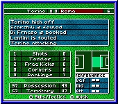 bekommen wir die Chance das Team zu ändern. Allerdings nur zwischen Ersatzbank und Mannschaft. Noch einmal die Taktik überprüfen und dann raus auf´s Feld. Ganz oben stehen die Teamnamen, die Zeit und das Ergebnis. Darunter läuft das Geschehen in kurzer Textform ab. Wer foult, wer wurde gefoult, wer hat eine Karte gesehen oder ist gar verletzt. Links unten ist die Statistik der Feld- und Ballbesitzanteile, Eckbälle, Torschüsse u.s.w. Rechts ist ein kleines Spielfeld, wo ein Cursor die momentane Angriffsrichtung ausgibt. Das