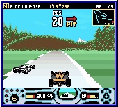 Wer unser Magazin schon länger liest kennt ja meine speziellen Einleitungen zu F1 Spielen. Wie oft habe ich immer wieder begonnen und mir gewünscht das Schumi nicht nur virtuell immer Weltmeister wird. Nun, dieses Jahr war es nun endlich soweit und die Aktion - rote Haare - konnte endlich steigen. Auch kann ich nun endlich mal meine Einleitungen ändern. :-) F1 Racing Championchip ist ein besonders Spiel. Denn es wird wohl das letzte F1 Spiel sein. Auf dem N64 sowieso, auf dem GBC höchstwarscheinlich. Aber es gibt je mittlerweile zumindest auf beiden Plattformen genug Auswahl, so das ein schöner Vergleich möglich ist. Ubi Soft’s Vertreter bringt nun endlich auch eine Lizens mit, was ja nicht immer so war. Allerdings nur die der letzten 99er Saison. Ja das waren noch Zeiten.., Eddie Irvine noch im Ferrari und ein Damon Hill im Jordan. Aber auch sonst hat sich Ubi einiges einfallen lassen um die Spieler für sich zu gewinnen. Das geht schon nach dem Einschalten los, wo man ein kurzes aber tolles Live Intro bekommt. Wenn man sich überlegt das auf dem GBA sowas als Spielgrafik kommt... oder sogar noch besser, dann sollte uns nicht bange sein. Wie in seinem RS Spiel kann der Spieler auf dem Hauptmenu zwischen den Punkten Simulation und Arcade wählen. Der dritte Punkt sind die Optionen, in denen man manche Dinge nur hier einstellen kann. Aber auch eine Weltpremiere bieten sie. Nämlich die Möglichkeit eine Cockpitansicht einzustellen. Auf dem GBC etwas völlig neues und wie sich zeigen sollte sehr gut gelöst. Desweiteren stellt man hier die Länge der Rennen von 3, 6 oder 9 Runden ein. Mehr hat man leider nicht zur Verfügung. Weiterhin kann man die Geschwindigkeitsangabe einstellen, ob Schäden aktiviert werden sollen und ob eine Karte eingeblendet werden soll. Den Punkt Automatik oder manuelle Schaltung kann man sich wie fast immer sparen. Ein Punkt der auf dem GBC fast nie Spaß macht. Die beiden Modis bieten in sich nur im Schwierigkeitsgrad Unterschiede. Ist die Steuerung im Arcade Modus etwas einfacher, so findet man auch hier nur den Mission Modus, den man mit dem Szenario Modus aus den F1 WGP Spielen kennt. Erste Kontakte sollte man aber schon mit dem Simulationsmodus machen. Wer hier besteht hat auch im Arcade Modus keine Probleme. Dieser bietet die Auswahl eines Einzelrennens, der Meisterschaft oder des Time Trials. Wählt man die Meisterschaft an gelangt man zur Fahrerwahl und entscheidet sich für einen der 22 Recken. Danach geht es ohne Umschweife zum ersten von 16 original Strecken. Positiv ist der Aufbau. Ihr könnt in einem freien Lauf die Strecke Testen um dann im Qualifying eine gute Startposition herauszufahren. Schon im Qualifying bemerkt man viele Liebe zum Detail was vor allem die Zeiten angeht. Zum einen wird die Zeit mit bis zu 3 Stellen nach dem Komma angezeigt und jede Strecke ist wie im realen auch in Sektoren eingeteilt, bei denen auch gemessen wird. Das geht dann auch soweit das oberhalb des Spielscreens immer die aktuelle Zeit mit der Bestzeit verglichen wird und Ihr die Abstände zu sehen bekommt. Im Rennen später werden euch je nach Position die Zeiten und Abstände nach vorn oder nach hinten angezeigt.
