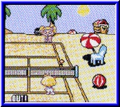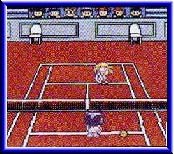 Doch nun auf den Platz. Zur Spielerwahl stehen am Anfang nur fünf Cracks und zum ersten mal sind die weiblichen Charaktere in der Überzahl. Doch die drei noch freizuspielenden Charaktere lassen uns auf später hoffen !!! Mit seinem Spieler stehen einem zu Beginn lediglich vier Turniere zur Auswahl. Auch wenn sie hier anders genannt sind, weiß jeder das es die vier größten Grand Slam Turniere im Jahr sind. Nach und nach werden bei erfolgreichem Abschneiden (sprich Sieg) im Turnier weitere Courts freigeschalten. So ändert sich dann der Belag oft vom Rasen, Sand, der Halle zum Strandtennis, Eistennis oder bis hinauf zum Mond. In Europa und dem Irish Cup finden wir uns in Wald und Wiesen Atmosphäre wieder. An jedem Turnier nehmen acht Spieler teil und der Sieger kommt eine Runde weiter. Da immer nur ein Satz gespielt wird, hat man nach drei gewonnenen Sätzen den Pokal in der Tasche. Der Spielscreen ist recht einfach gestaltet. Die beiden Akteure, ein Netz, ein Ball und der Oberschiri auf seinem Turm. Die Stühle für die Linienrichter sind zwar da, aber denen scheint keiner Bescheid gesagt zu haben, denn sie sind nicht da. Unten im Bild erfährt man den aktuellen Spielstand und die Einblendung Break- bzw. Matchball. So simpel wie die Grafik ist auch die Steuerung. Es gibt zwei Schlagvarianten, den Lob und den Slice. Diese variieren nur durch die Stellung zum Ball (Vor- oder Rückhand) und die Stärke des Schlages. Da der Slice von der Grundlinie immer ins Netz geht und der Lob vom Netz meistens ins Aus fliegt, muß man sein Spiel unterschiedlich gestalten. Und immer schön in die Ecken oder Long Line spielen, da hat man den meisten Erfolg.
