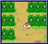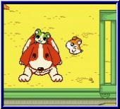 Bei 85 Wörtern wird dabei aber das Gedächtnis des Spielers sehr gefordert und der Lern Effekt ist recht hoch. Denn lauft Ihr durch die Locations, so könnt Ihr per A-Taste ein Menu aufrufen, das euch meist 4 Grundwörter zur Verfügung stellt. Ihr könnt wie schon erwähnt jemanden ansprechen, per -Bautz- Wort eine Rolle machen um z.b. gegen einen Baumstamm zu rollen von dem nun etwas herunterfällt. Dazu könnt Ihr schnüffeln oder Graben. Mit diesen 4 Grundaktionen seid Ihr gerüstet. So folgt der Rest in vielen kleinen Abhängigkeiten. Spricht man z.b. einen schlafenden Charakter an, so weckt man diesen, der sich nun beschwert und dabei ein neues Wort nennt. Dieses neue Wort wird eurem Wörterbuch hinzugefügt und kann nun bei einer anderen Aktion genutzt werden. Die Möglichkeiten sind durchaus vielschichtig und enden oftmals auch in kleinen Rätseln. Denn findet man einen der 12 Hamster so kommen die noch lange nicht mit euch nur weil Ihr Hallo gesagt habt. Normale Gespräche laufen dabei komplett deutsch ab. Nur die Schlüsselworte des Ham-Chat werden in der typischen Schreibweise auch farblich dargestellt. Je nach Situation wird die Auswahlbox mit Wörtern auch erweitert und gibt dem Spieler dadurch mehr Möglichkeiten. Weiterhin sind Dinge eingebaut wie ein Shop, in dem Ihr euch neu Einkleiden könnt oder aber anderen Ham-Hams etwas bringen könnt. Auch ein Teilbereich um sie eventuell zum mitkommen zu überreden. Kleidet Ihr euch selber damit ein kann man dies später im Clubhaus, in dem jeder Ham-Ham ein eigenes Zimmer hat selber anprobieren und als Foto speichern. Dazu kommt das Feature Ham-Jam, das auch später über das Hauptmenu anwählbar ist. Hier könnt Ihr Tänze lernen und eigene erstellen. Nach fertigen Musikstücken könnt Ihr so durch Tastendrücken eigene Bewegungsabläufe erstellen und auch speichern. Über die Infrarot Schnittstelle des GBC kann man seine eigenen Tanzvarianten auch mit einem anderen Hamtaro Spielern tauschen. Gelungen ist die grafische Darstellung des Spiels. Zwar sind GBC Spiele nun nichts mehr das den Spieler aus den Socken haut, gefällt mir aber von der Farb und Detailfülle besser als eine Pokemon. Auch weil man die Ham-Hams recht groß gemacht hat und sie dadurch gut zu unterscheiden sind. Der Sound ist eher typisch japanisch und kommt manchmal mit recht schrägen Tönen daher. Kleine Soundeffekte, die man in Zeiten eines GBA aber eher belächelt. Technisch nicht anders zu lösen aber nichts was einen vom Hocker haut. Auch wenn ich selber keine Kinder habe ist dieses Game einer der typischen Knuddel-Niedlich-Süß-Kunterbunt Vertreter, der vor allem kleinen Mädchen gefallen dürfte. Der Tiefgang beschränkt sich auf den Ham-Chat und das damit mögliche Lösen von kleinen Rätseln im Spiel. Nicht gleich alles anwählbar muß der Spieler sich alles erspielen. Eine kleine heile Welt, die mit Hamtaro einen idealen Knuddel Charakter bietet. Aber eben nur für eine bestimmte Zielgruppe. |